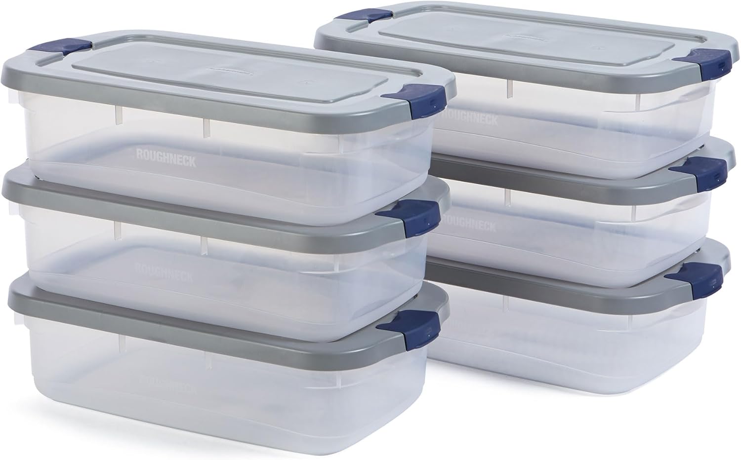 Rubbermaid Roughneck Clear 31 Qt/ 7.75 Gal Storage Containers, Pack of 6 with Snap-Fit Grey Lids, Visible Base, Sturdy and Stackable, Great for Storage and Organization