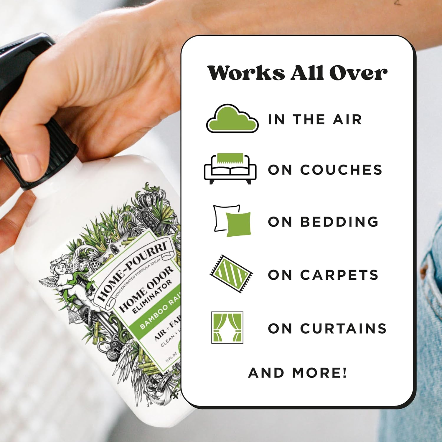 - WORKS ON: AIR, CURTAINS, CARPETS & RUGS, COUCHES & BEDDING, TRASH CANS and more! Made by the makers of Poo~Pourri, so you know it works!