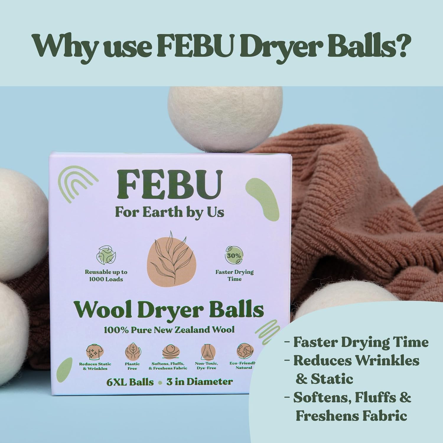 - NATURALLY SOFTENING & STATIC REDUCING — FEBU reusable wool dryer balls help soften your laundry while reducing static, so your clean laundry is always soft and free of static & wrinkles.