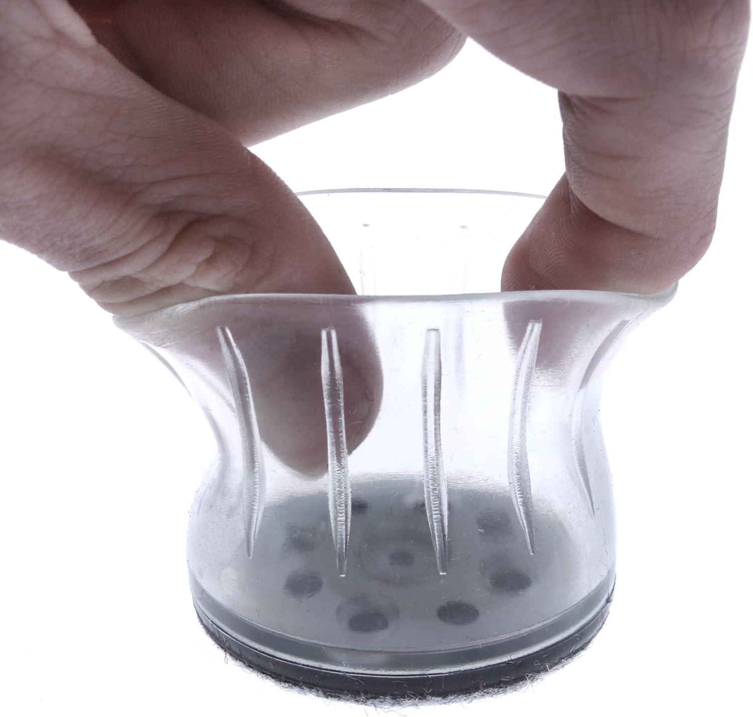 - Fits square & round furniture legs – These stretch to fit chair pads securely fit round legs 1-1/2” to 1-3/4” in diameter (38 – 44mm) and square legs 1-3/8” to 1-5/8” in diameter (34 – 40mm). The tube that holds the furniture leg is made of an advanced polymer material that is strong, tear resistant, long lasting, and clear for low visibility.