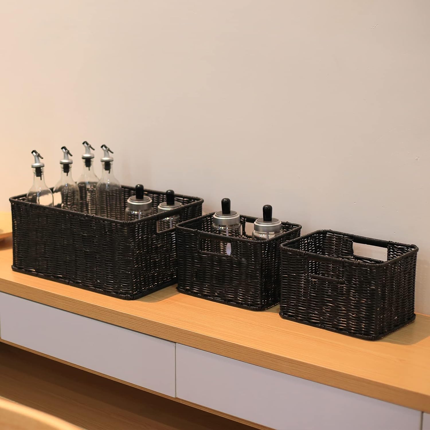 HOONEX Large Wicker Baskets for Storage, Woven Plastic With Dual Handles, Set of 3, Black