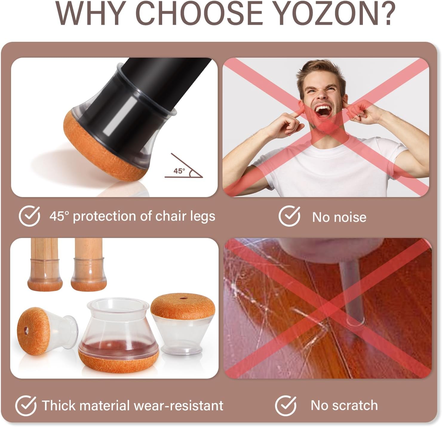 - [Reinforced bottom felt pad]-These chair leg protectors are designed for angled chair legs. The upgraded cup-shaped felt pad grips the chair legs securely. Even when the chair is tilted, it stays stable while protecting your floors from scratches and noise.