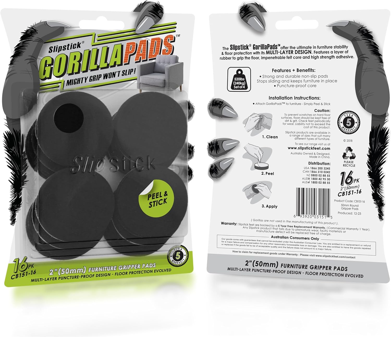 - Mighty grip that won’t slip – GorillaPad furniture grippers by Slipstick are the universal solution to stop furniture sliding and unwanted movement of furniture / objects and effectively protect all hard surfaces from scratches or damage. Includes 16 x 2” round non slip furniture pads