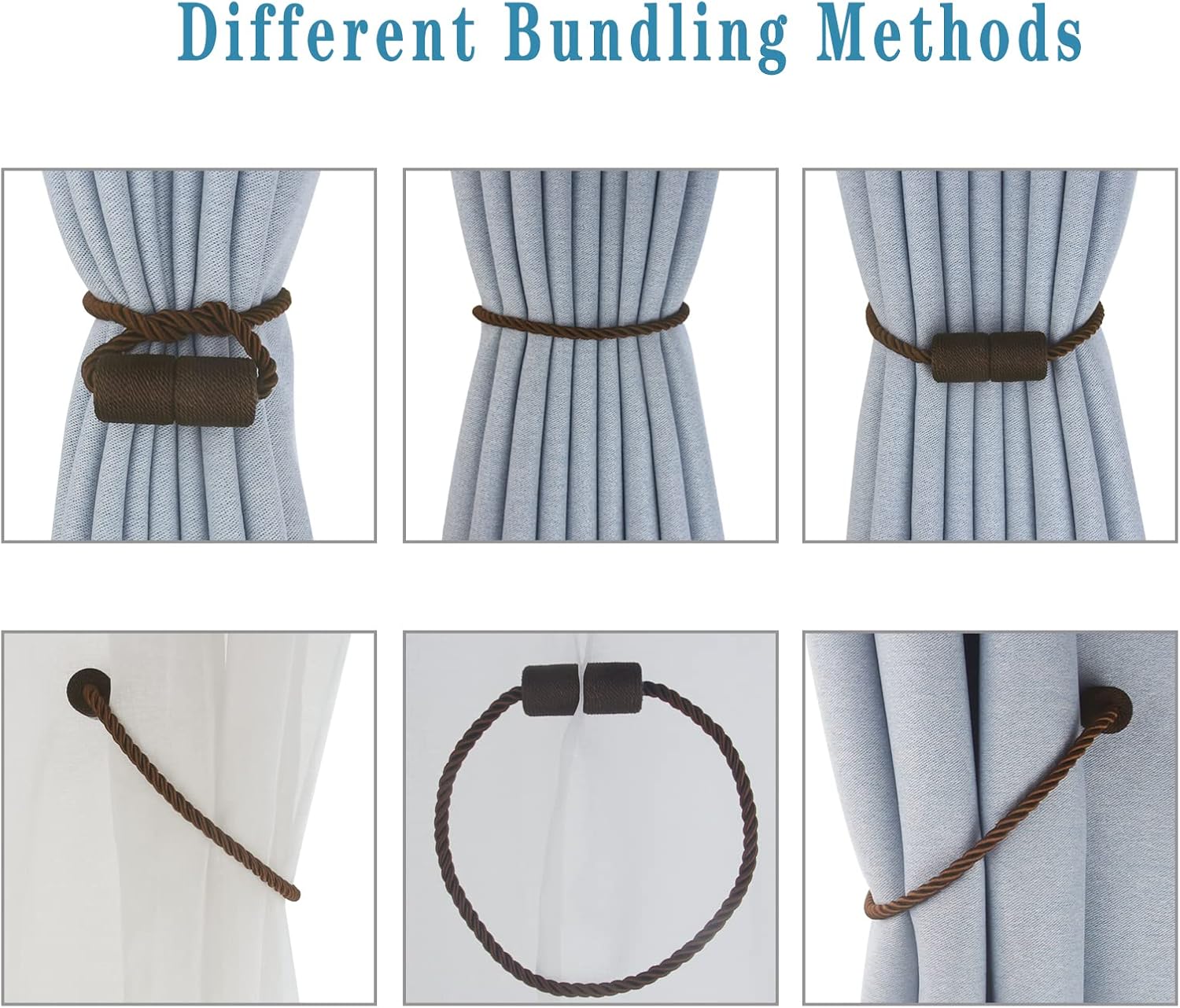 - High-Quality Materials- Magnetic curtain tie backs use an upgraded version of nickel-plated magnets, which are strong and smooth. The brightly colored twisted woven ​texture rope is hand-woven with premium polyester materials. very soft and good feeling. Beige/Gold/Black/White/Grey/Khaki/Coffee/Blue -Eight colors to choose from