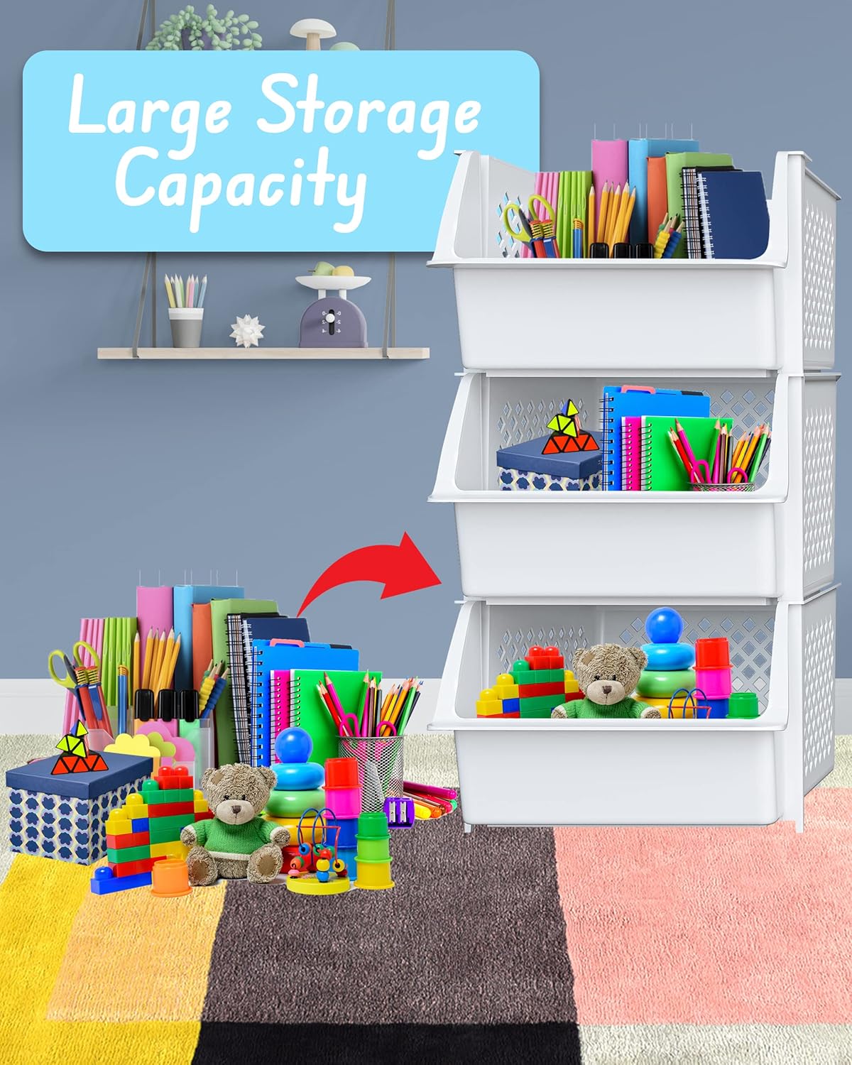 - KEEPS ESSENTIALS ORGANIZED AND VISIBLE - Stackable bins hold foods, toys, utensils, and toiletries without bending off. Set of 3, Each bin size: 14.5” x 11.5” x 7”.