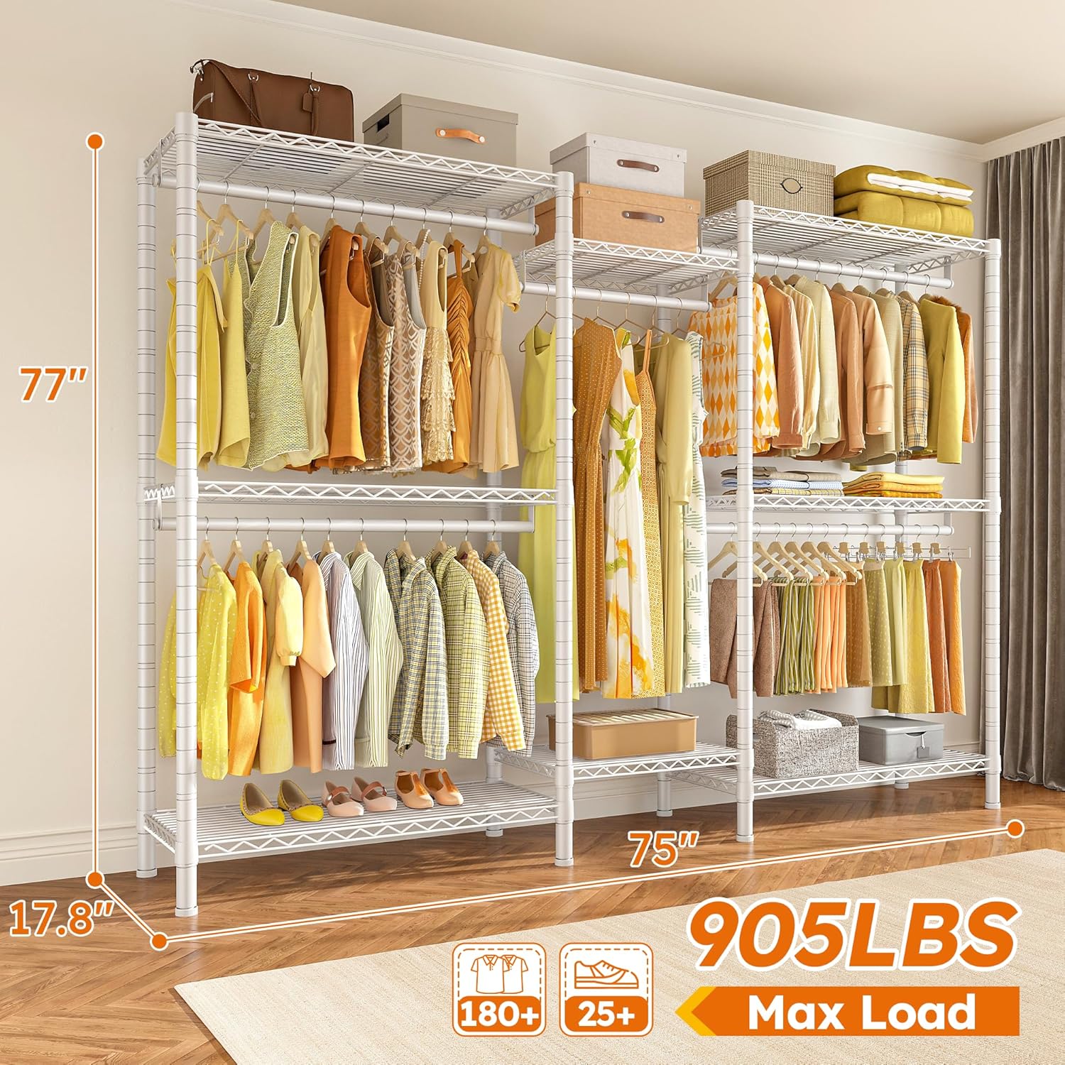 - 【Extra Large Size & 905LBS Capacity】Clothes rack heavy duty with 77"H x75"W x17.8"D large size & 905LBS total weight capacity! You can put at least 180-200 clothes and a lot of other things on this heavy duty clothes rack, and the special heightened design makes clothes wrinkle-free.