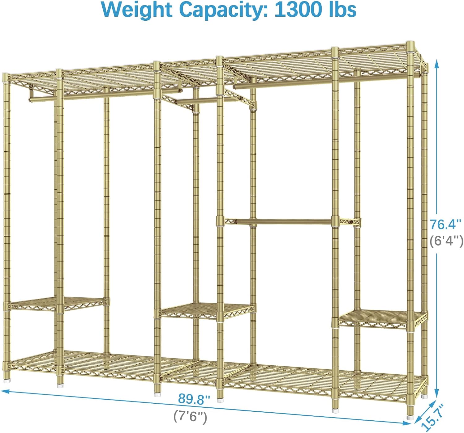 - Dimensions & Load Capacity: 89.8" L x 15.7" W x 76.4" H. Load capacity up to 1300 lbs. Single hanging rod can support up to 75 lbs, and wire shelf can support up to 88 lbs for each.