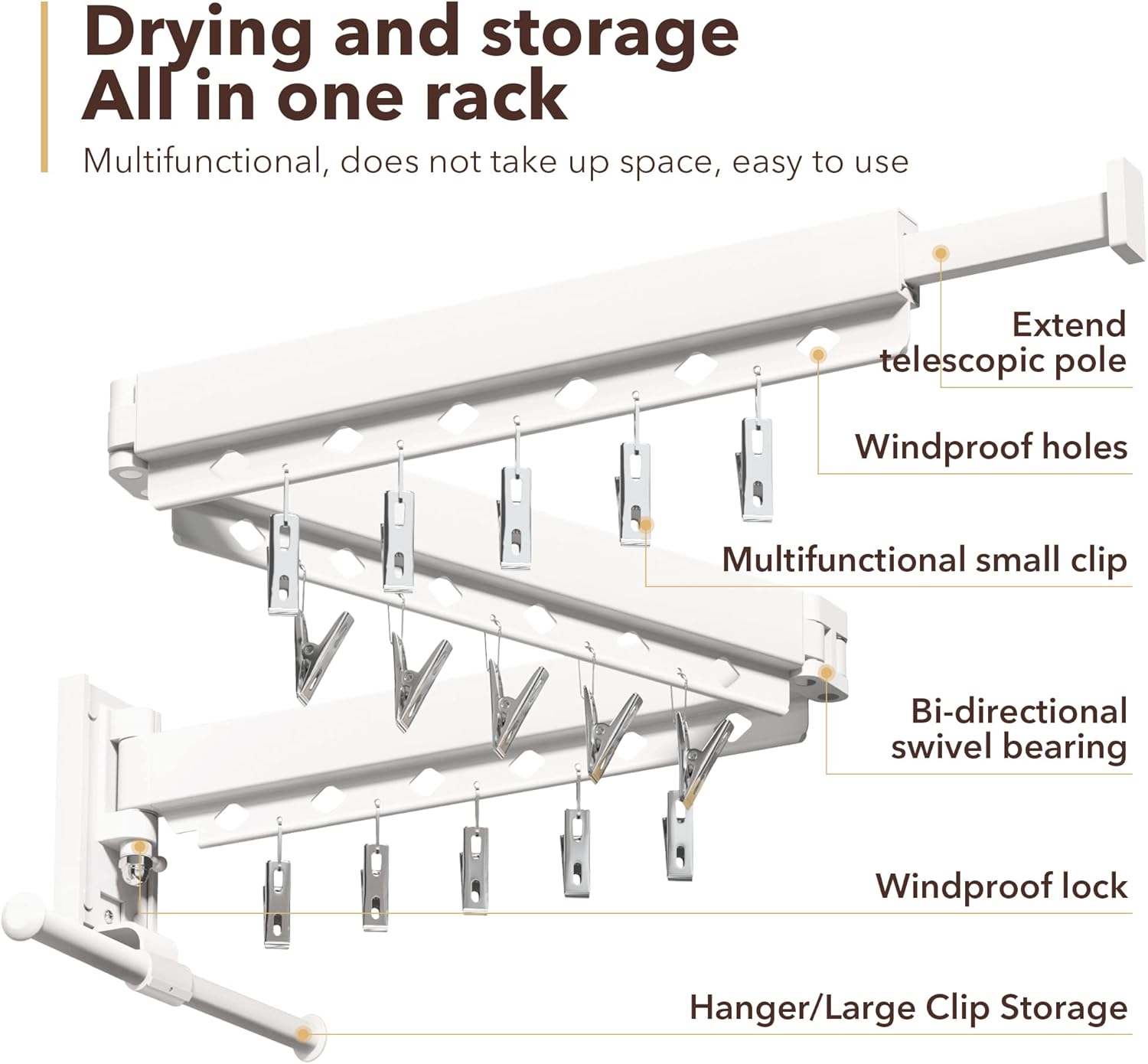 - ****【18 wind-proof holes + 15 wind-proof clips】This wall-mounted clothes rack is unique compared to other clothes racks because it features 18 wind-proof holes and 15 wind-proof clips. These additional features not only allow for efficient drying of clothes but also provide a better drying solution for socks and other small items.