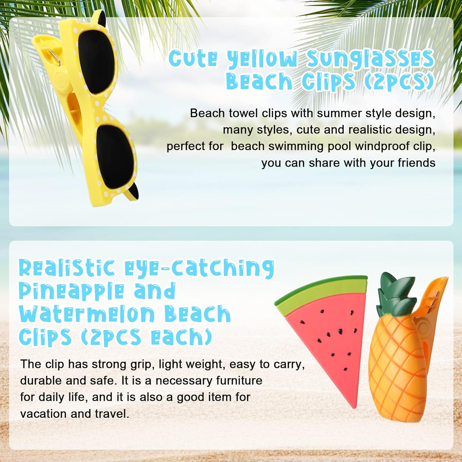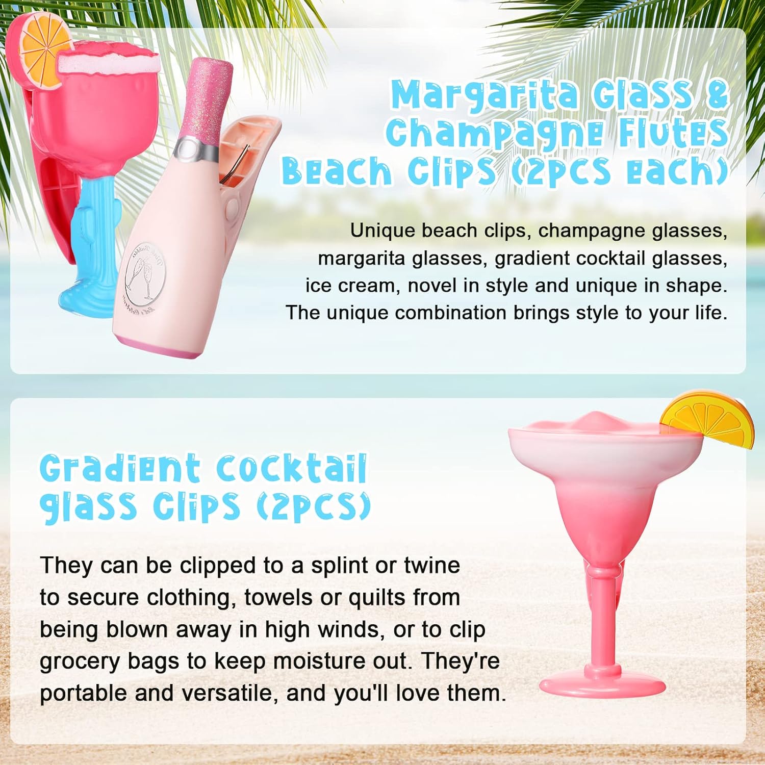 - Cute and Funny: these beach towel clips adopt champagne glasses, margarita glasses, cocktail glasses, sunglasses, pineapple and watermelon styles, look cute and funny, you can use them to clip cloths, towels or bedding