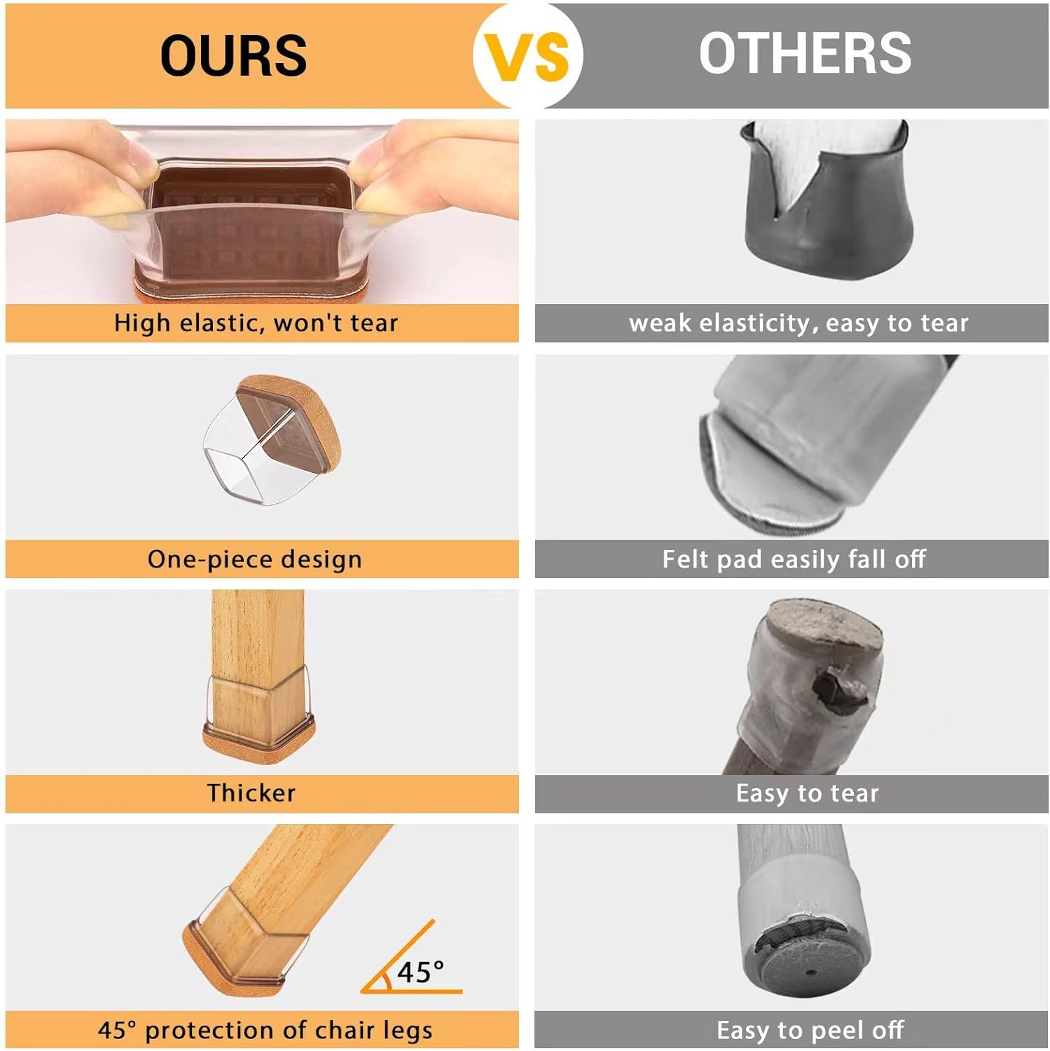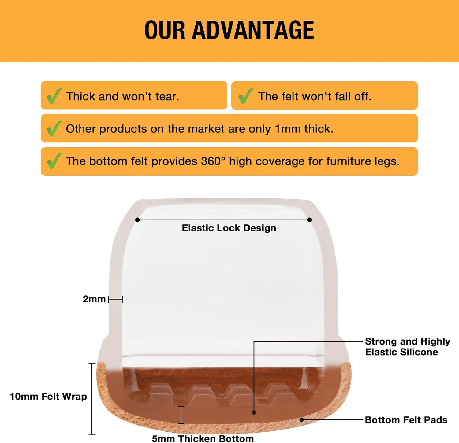 - 【Upgrade New Design】: 360° full felt pad bottom wrapped, which helps the felt bottom be able to touch the floor at any angle, preventing scratching the floor. Our chair leg floor protectors do not use gel. The bottom felt pad and the silicone chair leg floor protectors are integrated with a high-pressure machine to ensure that they will never fall off.