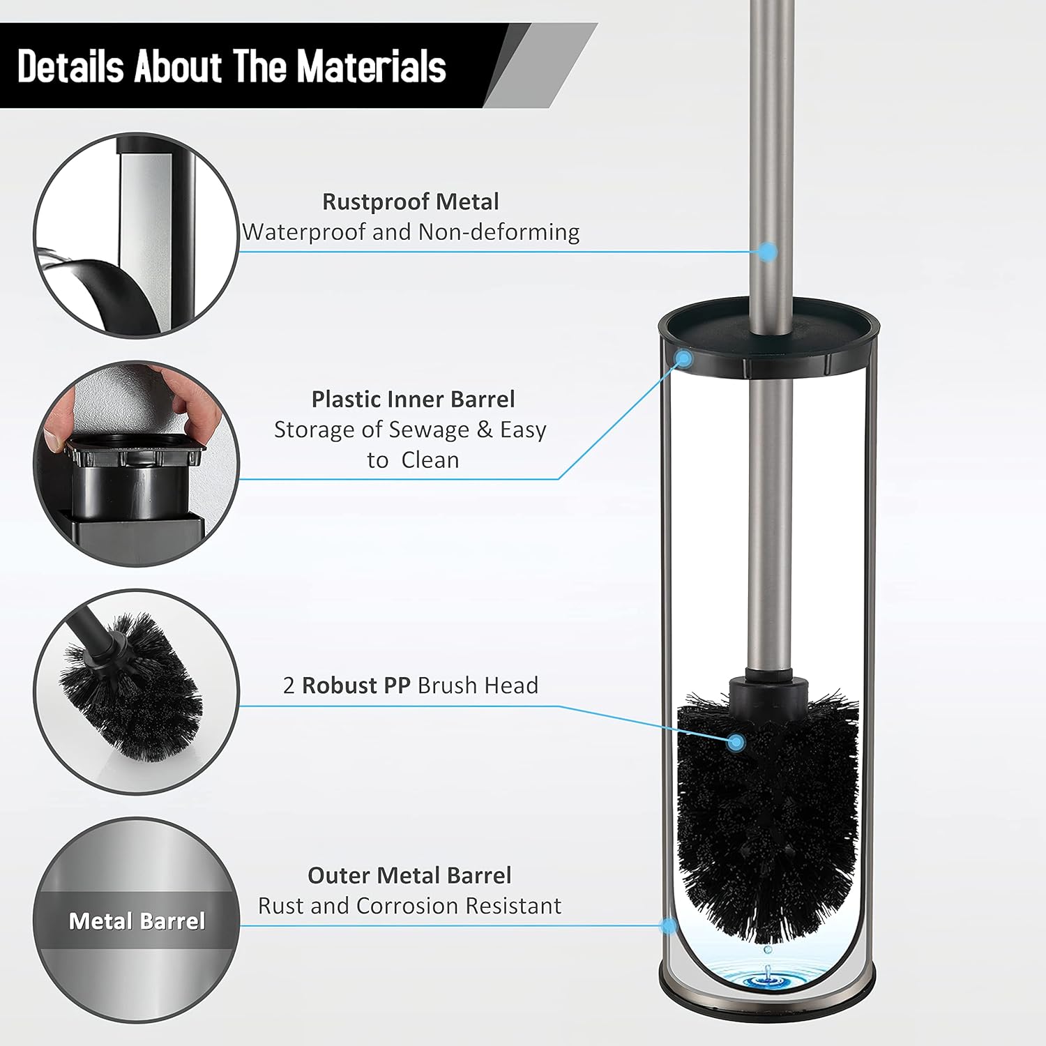 - Splash-proof design:BGL brushed nickel toilet brush set has a cover at the handle to prevent the sewage from splashing on the hand when cleaning the toilet. The cover baffle design protects your hands from stains and block the spread of odors, prevents scratching the toilet when cleaning.