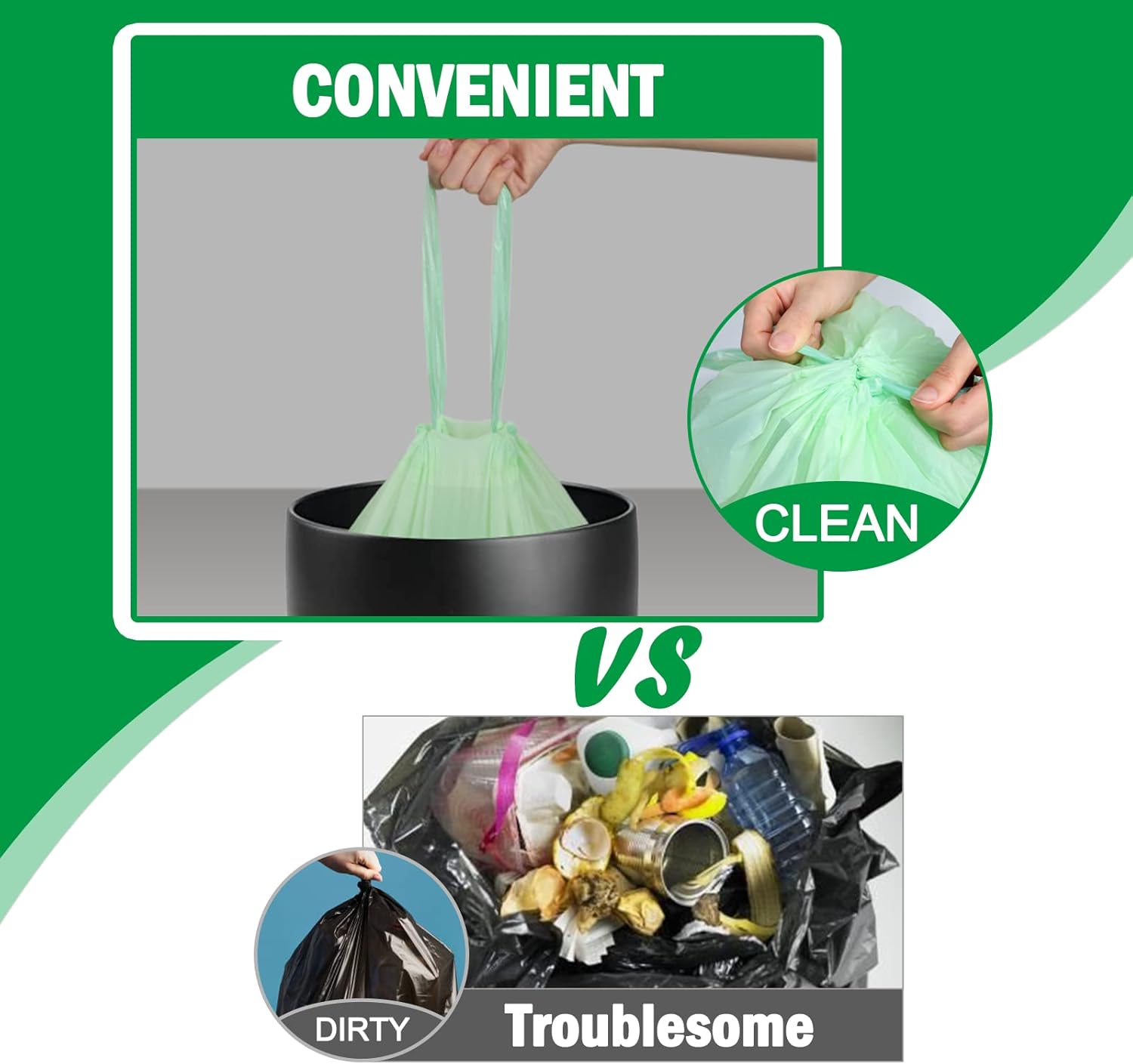 - Durable Compost Bags: Trash bags are durable, non-toxic and easy to use. Use as kitchen garbage bags are stretchable to accommodate oversized loads without puncturing, leaking or tearing.