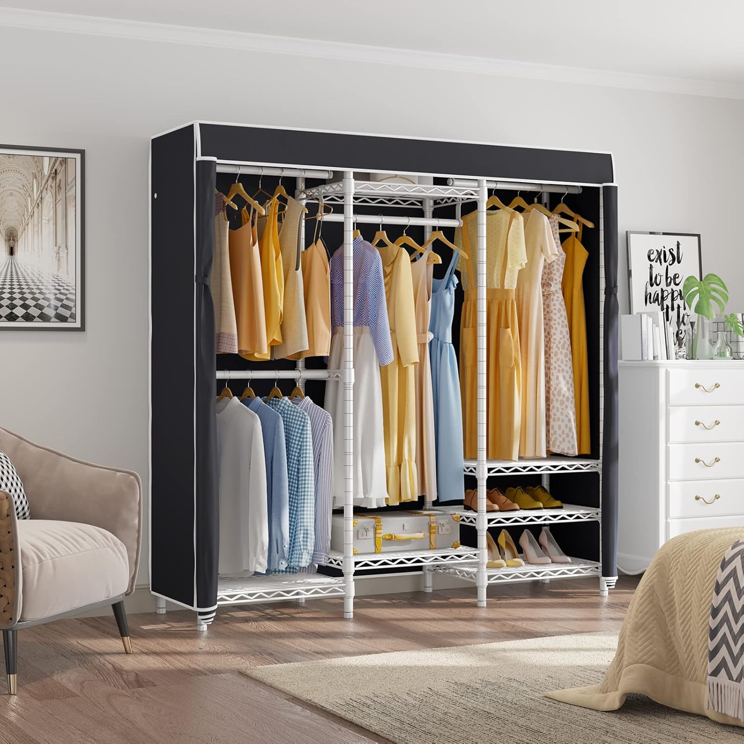 - Multifunction Closet Rack: VIPEK V5C Portable Closet comes with 8 adjustable Shelves & 4 removable hanging rods, it's possible to configure in different ways. Assembly was quick and easy. Raise or lower the shelving to customize the Well-Organized wardrobe closet of your dreams, and MAXIMIZE YOUR SPACE!