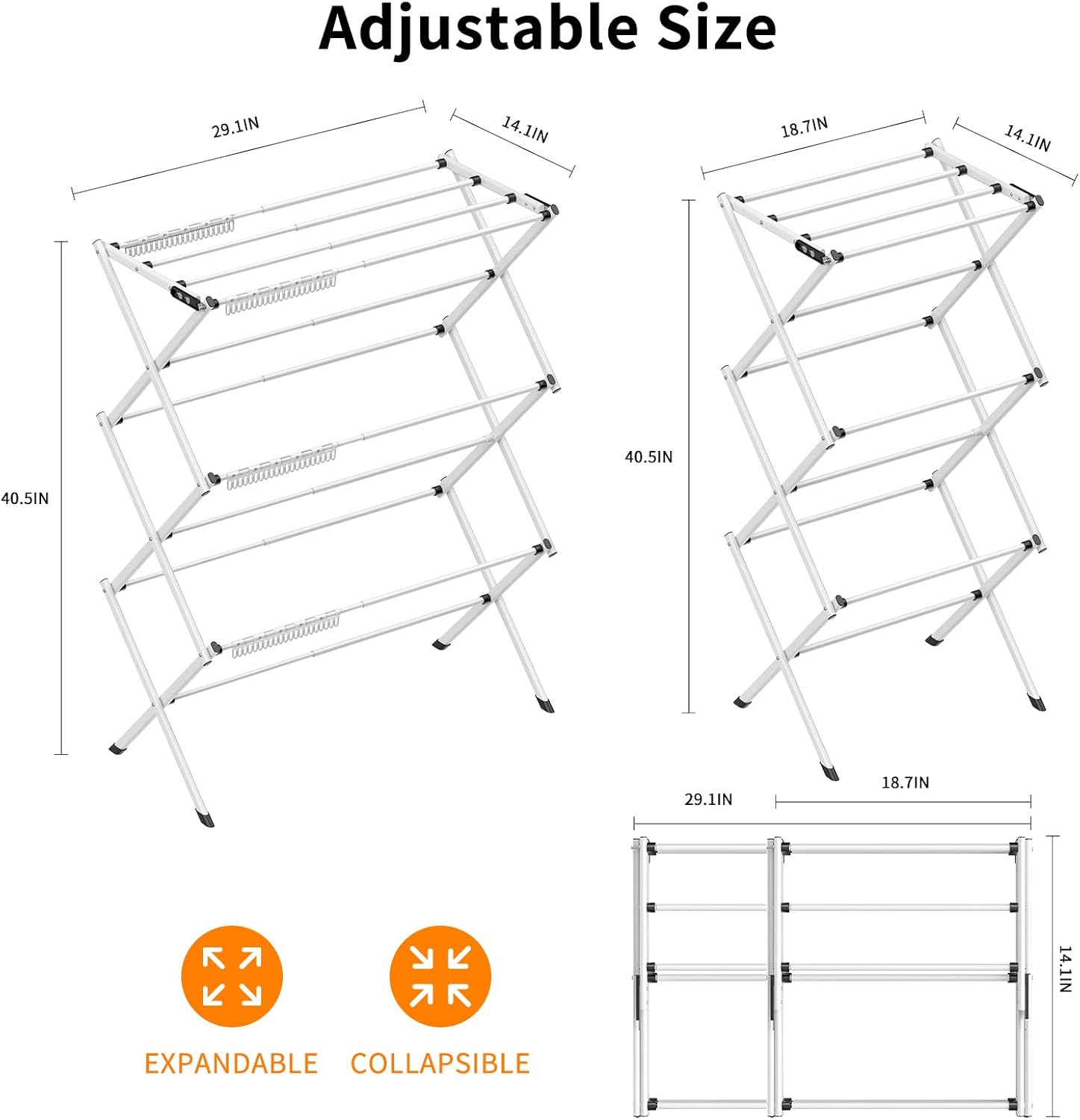 - ★ Retractable: Clothes rack size: L 19.1"-28.8" x W14.2" x H40". The retractable drying rack has a large drying space, which can meet all your clothes drying needs and adapt to different scenes.