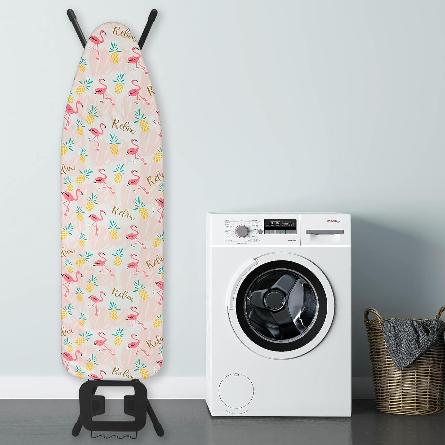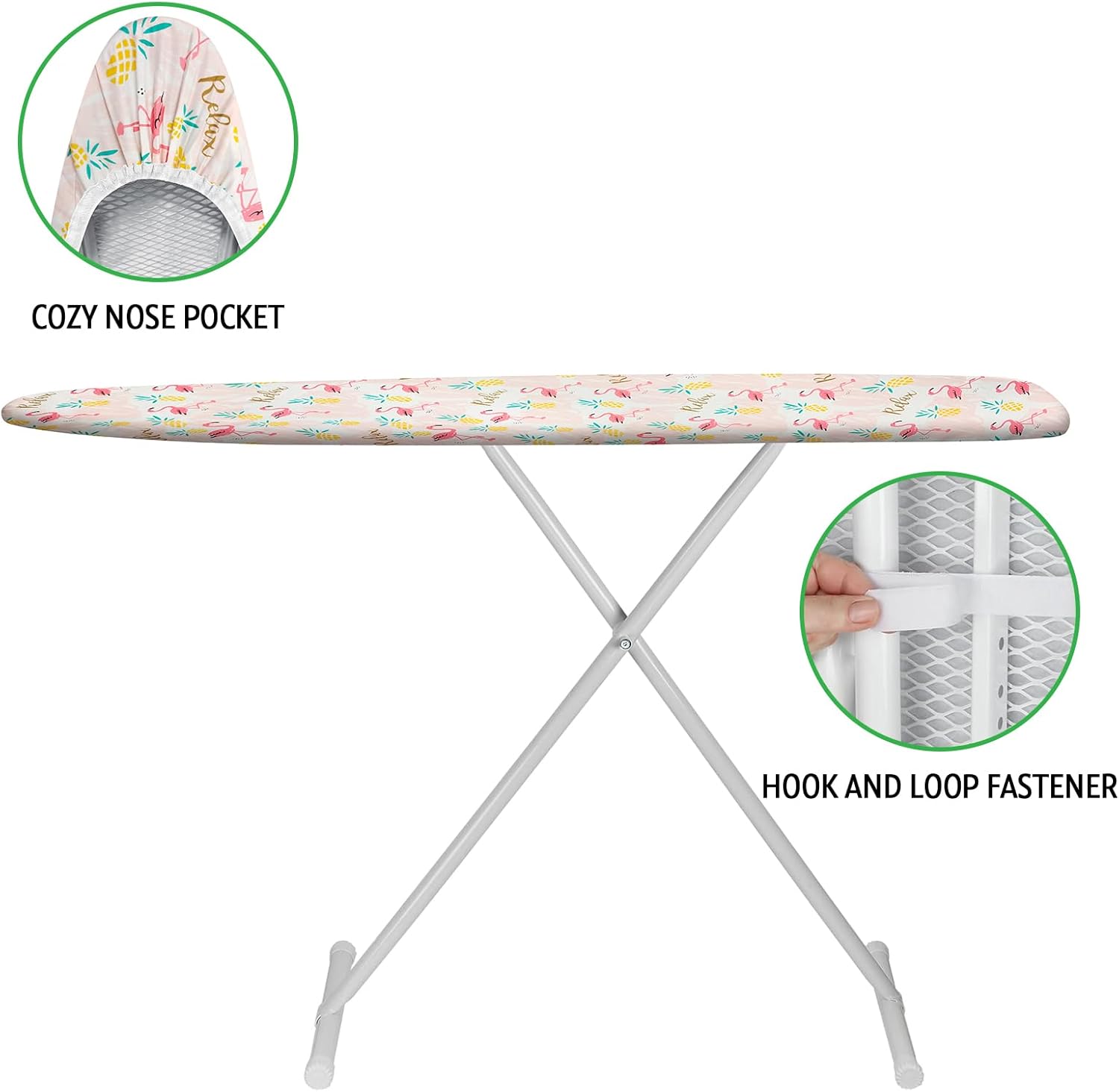 - SECURE FIT: the nose pocket design with elasticized edges and hook and loop fasteners straps ensure securely non-slip fits and keep the ironing board cover in place on standard sized ironing board. No need to worry about your ironing board covers slipping.Make your ironing chores more smooth and enjoyable