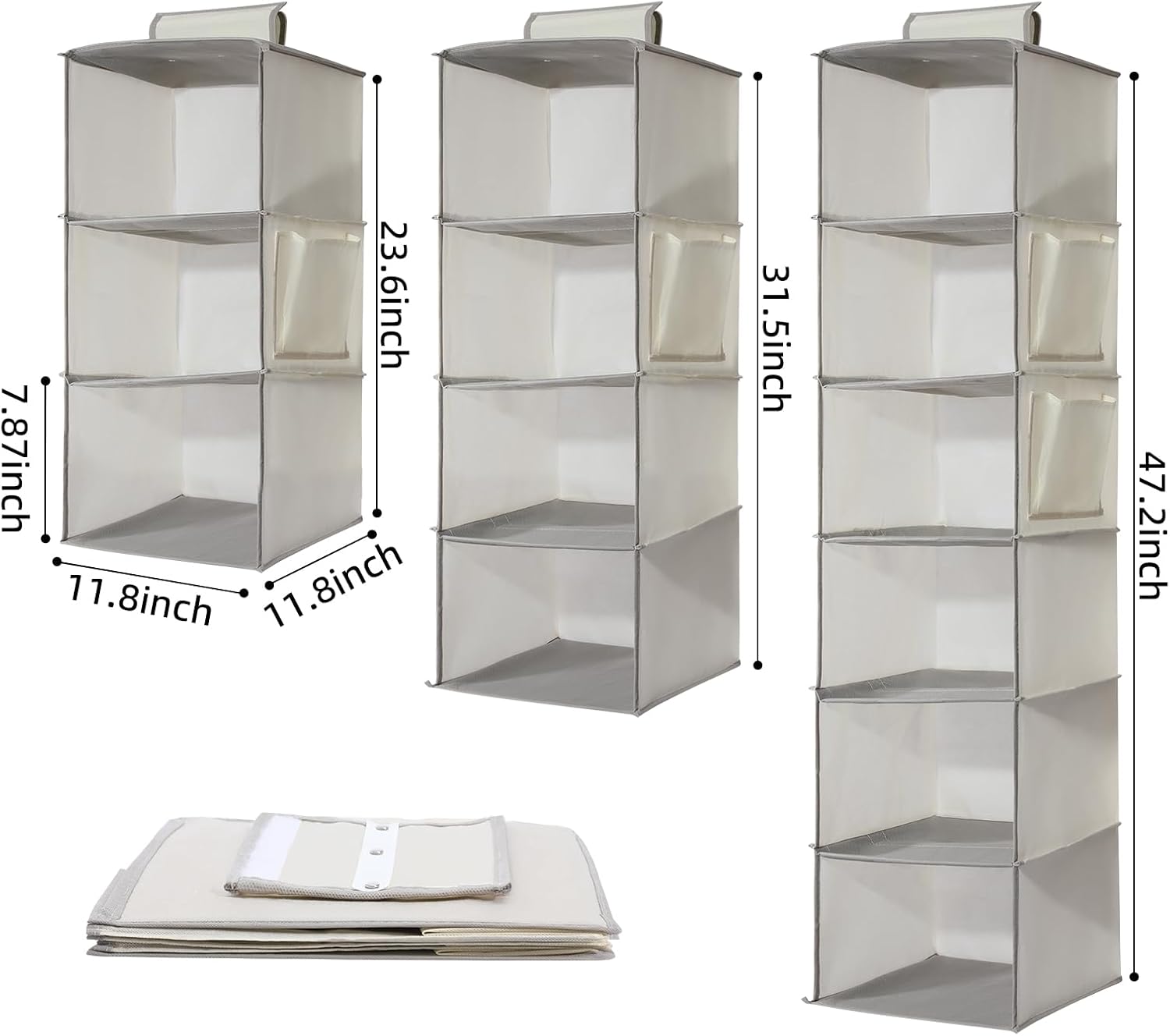 - 【Product Dimensions】You will get 2 packs of hanging shelves. This overall size is 11.8"(L)*11.8"(W)*31.5"(H). Each unit is 11.8"(L)*11.8"(W)*7.87"(H).Before buying, it is recommended to measure the distance between your closet rod and the floor to see which model would be best for you.