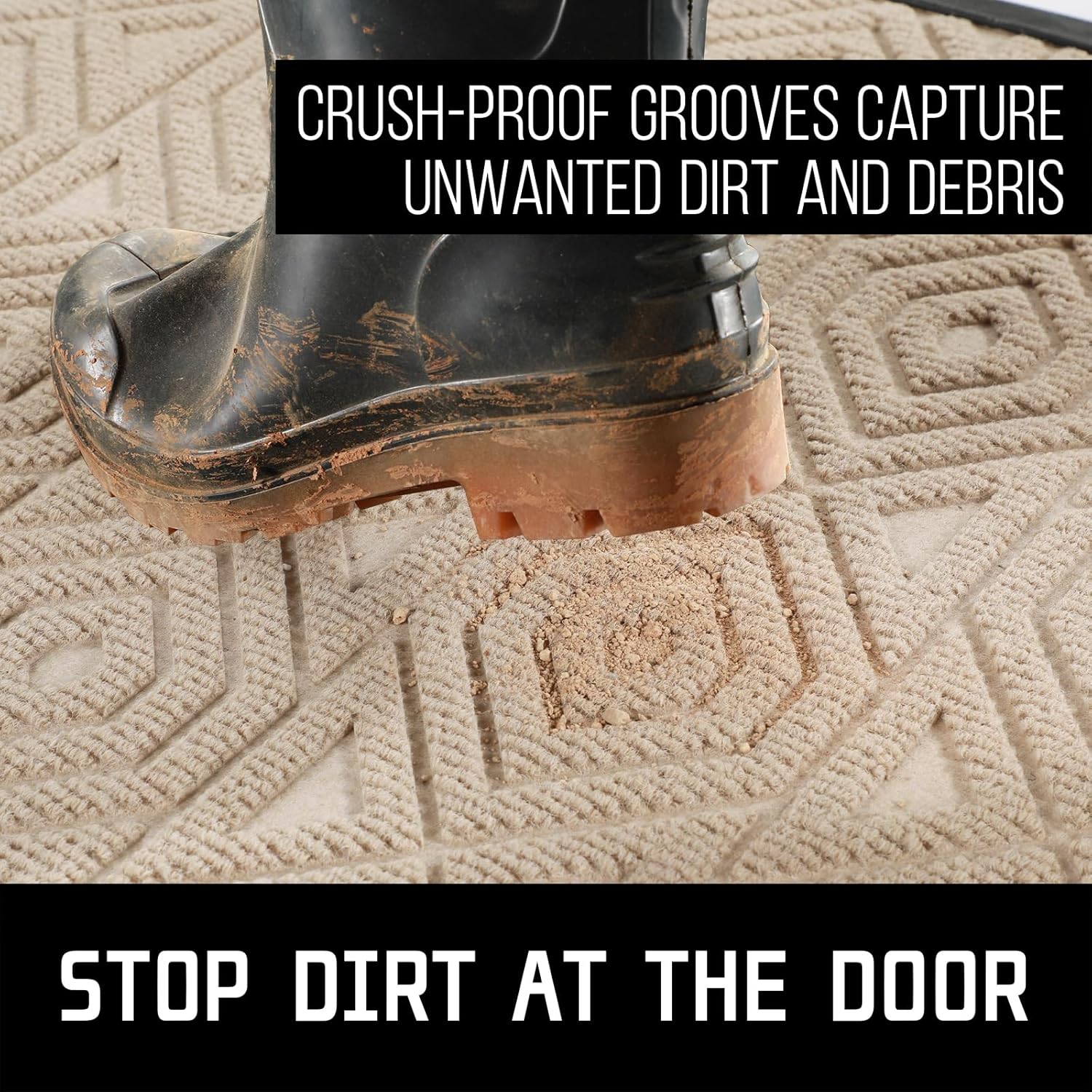 - [CAPTURE DIRT AND MOISTURE] Yimobra front door entryway mat outdoor with unique pattern design, forming a detention dam extending in all directions, helping to capture dirt, dust, gravel, mud, sand, grass or other messy debris and prevent them from entering Indoor; The surface of floor mat beautifully woven polyester fabric absorbs moisture, and the sturdy oblique rubber edge will not accumulate water in rainy and snowy days, keeping your home dry and clean