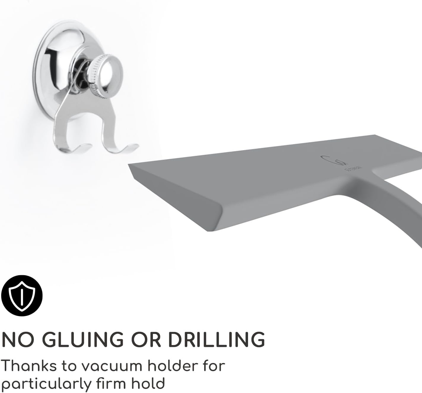 - SUPER STRONG SUCTION HOOK - No drilling or gluing required! You can easily remove and reattach the squeegee stainless steel hook to smooth surfaces such as panes, tiles, shower walls, shower glass surfaces, doors, cubicles, and enclosures.