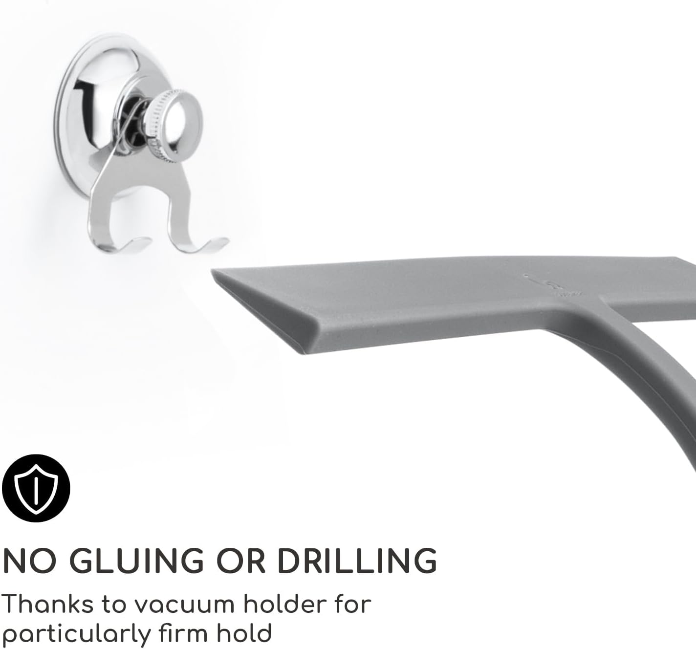 - SUPER STRONG SUCTION HOOK - No drilling or gluing required! You can easily remove and reattach the squeegee stainless steel hook to smooth surfaces such as panes, tiles, shower walls, shower glass surfaces, doors, cubicles, and enclosures.