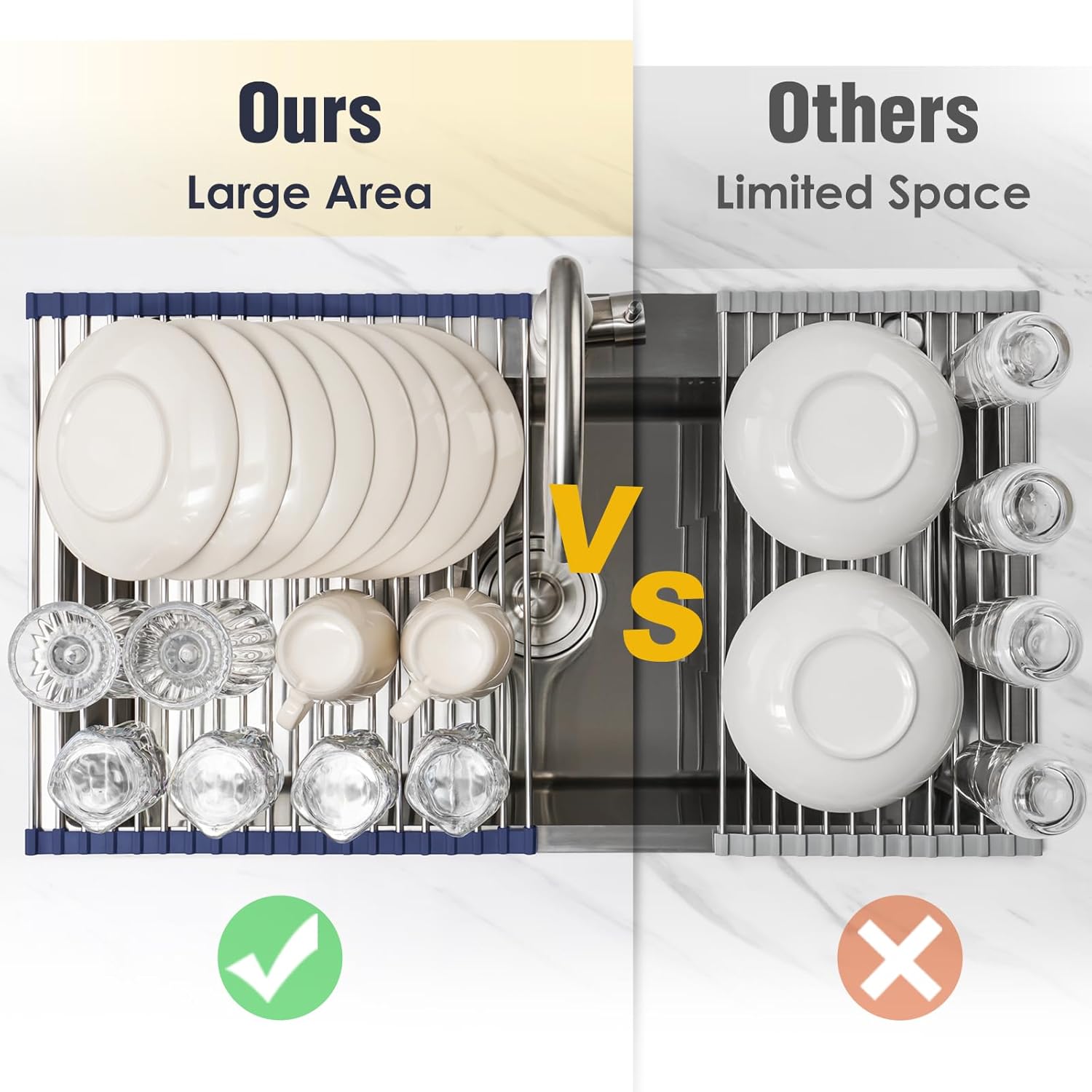 - [Multipurpose Drying Rack] - Perfect for air-drying kitchenware such as dishes, mugs, bowls, pans, glasses, cups, plates, cookware, cutlery, saucepans, bottles, and even fruits and vegetables. A must-have kitchen gadget.