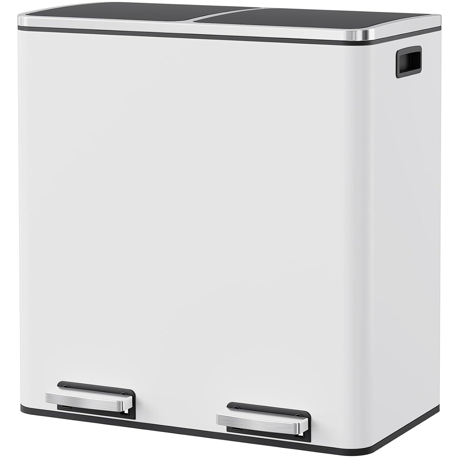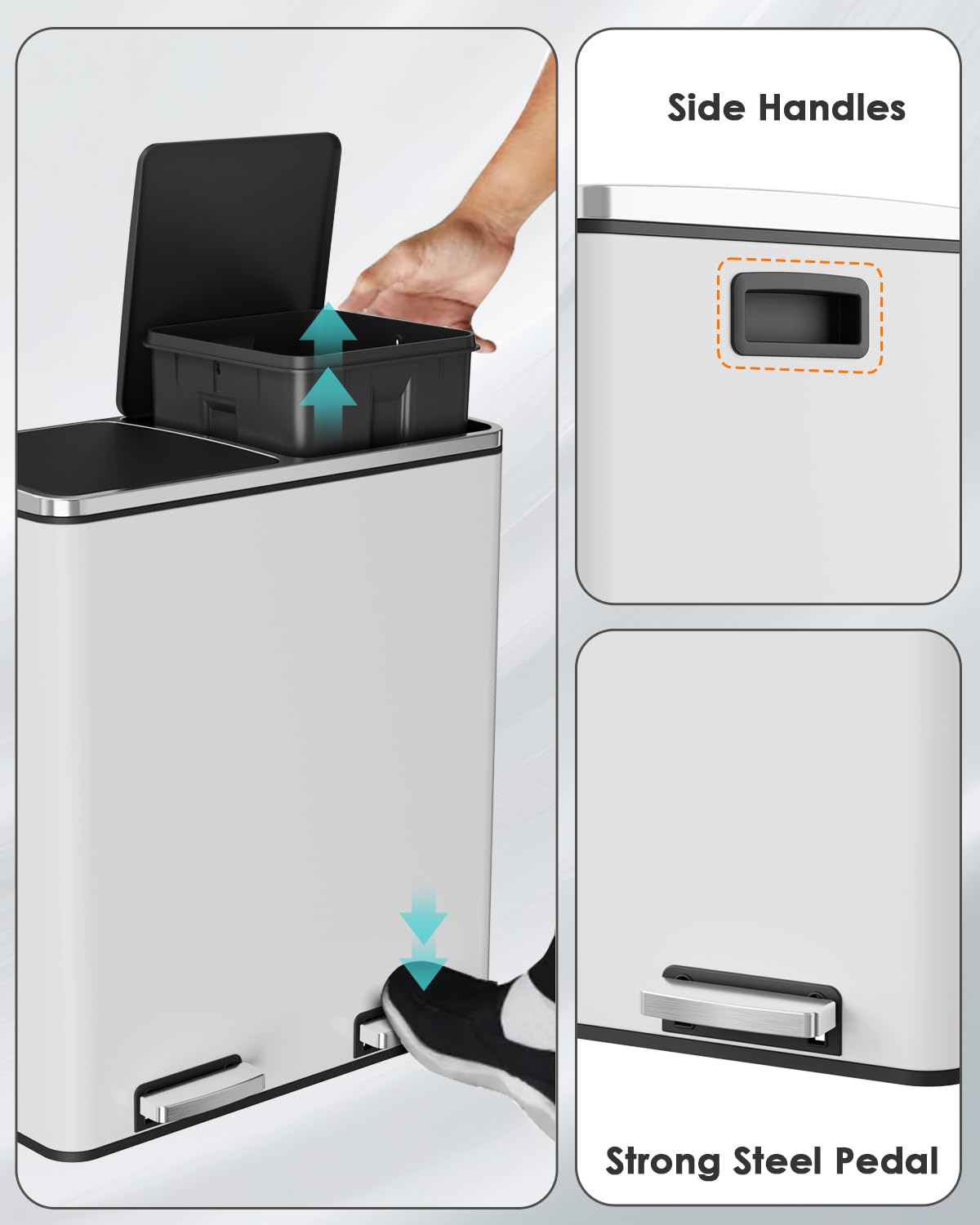 - WIDEN PEDAL&SIDE HANDLES: Dual trash can includes 2 non-slip metal pedals that can open 2 lids individually, free your hands and cleaner. With 2 portable side handles, we can move it easily.