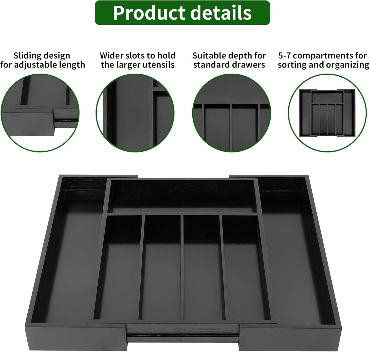 - Upgrade Your Kitchen Display: Hold your kitchen utensils, knives, spatulas, spoons and forks invisible in drawer; This wood silverware drawer organizer has 5-7 compartments and provides enough space to place utensils
