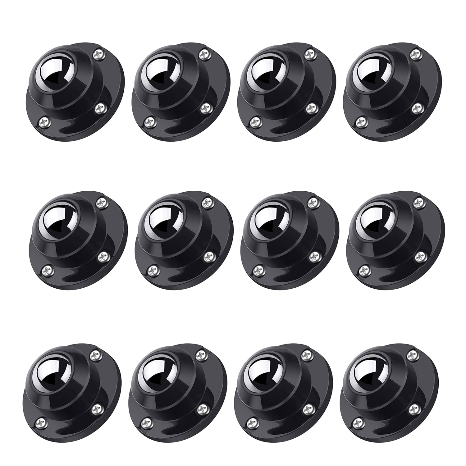 - 【Load Capacity】28 lbs each wheel. Total 110 lbs for 4 wheels, 220 lbs for 8 wheels, 330 lbs for 12 wheels. Wheel Size: Total height 24mm (1 inch) , mounting plate diamater 44mm (1-3/4 inch) , mounting hole diameter 4mm, distance between diagonal holes 36mm. Package Includes: Mini wheels x 12, adhesive pads x 12, screws x 48.