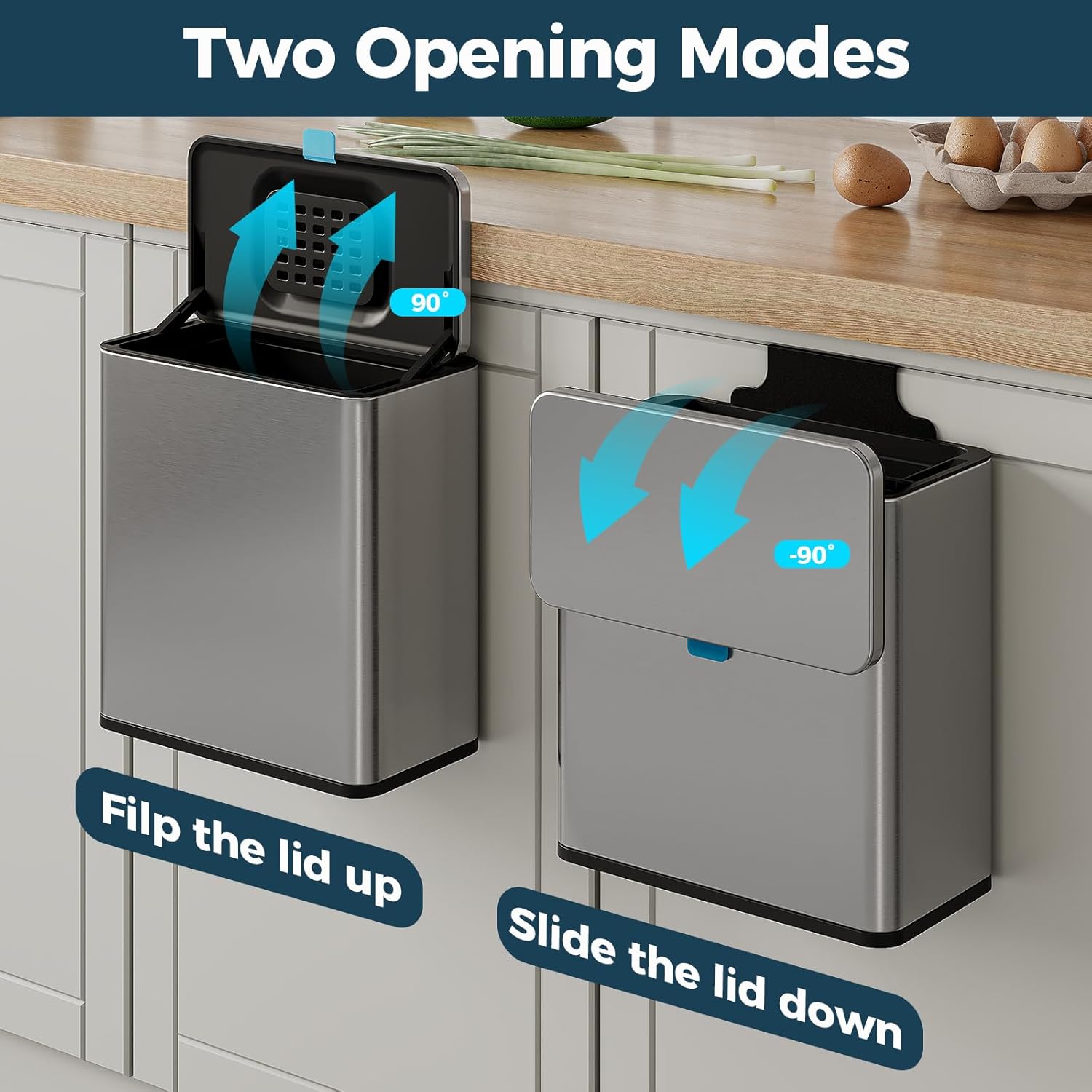 Stainless Steel Hanging Trash Can with Lid and Inner Bucket, 2 Gallon Kitchen Compost Bin for Counter Top, Under Sink or Wall Mount, Small Garbage Can for Cupboard/Bathroom/Bedroom/RV