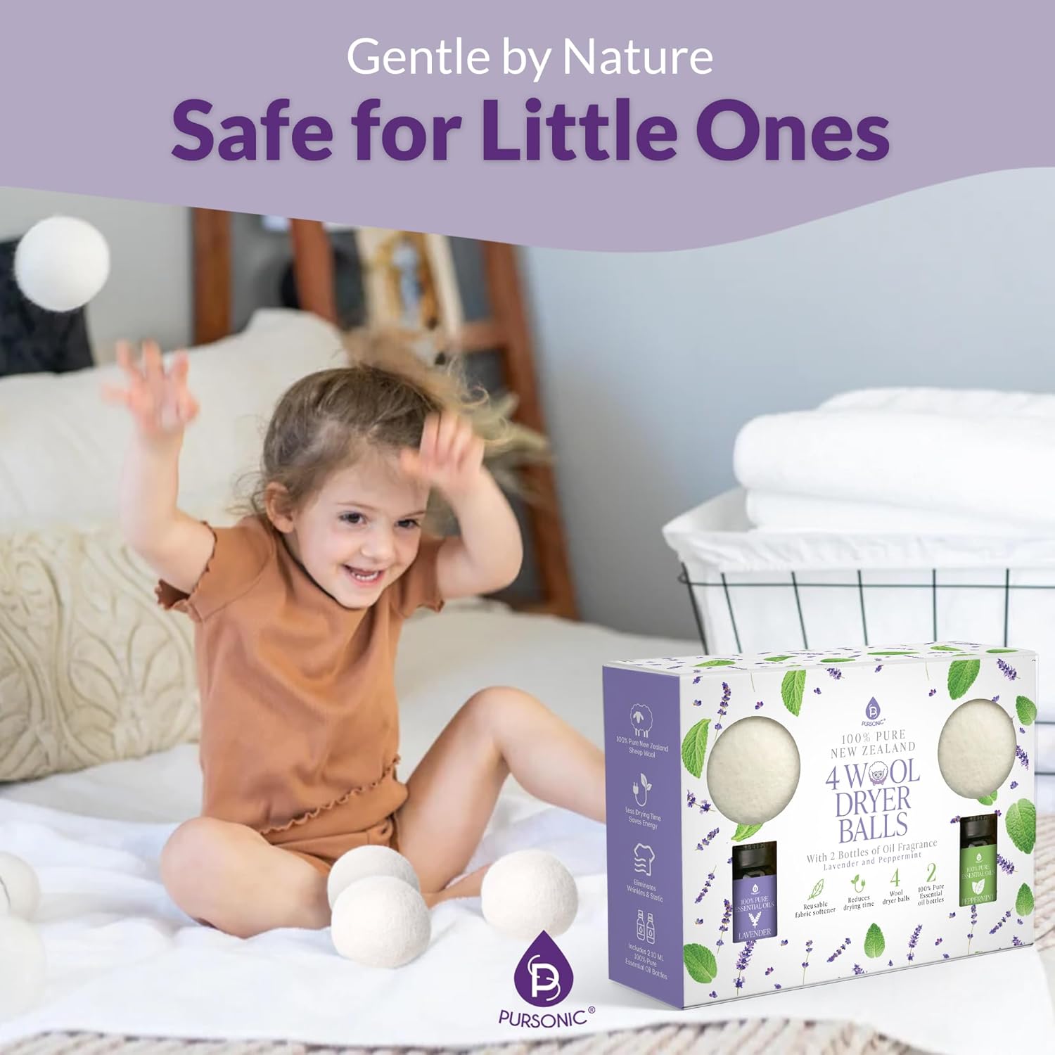 Pursonic 4-Pack Laundry Wool Dryer Balls with Lavender & Peppermint Essential Oil Scent - Reusable Fabric Softener Balls Made from Pure New Zealand Wool - 2.75" Diameter