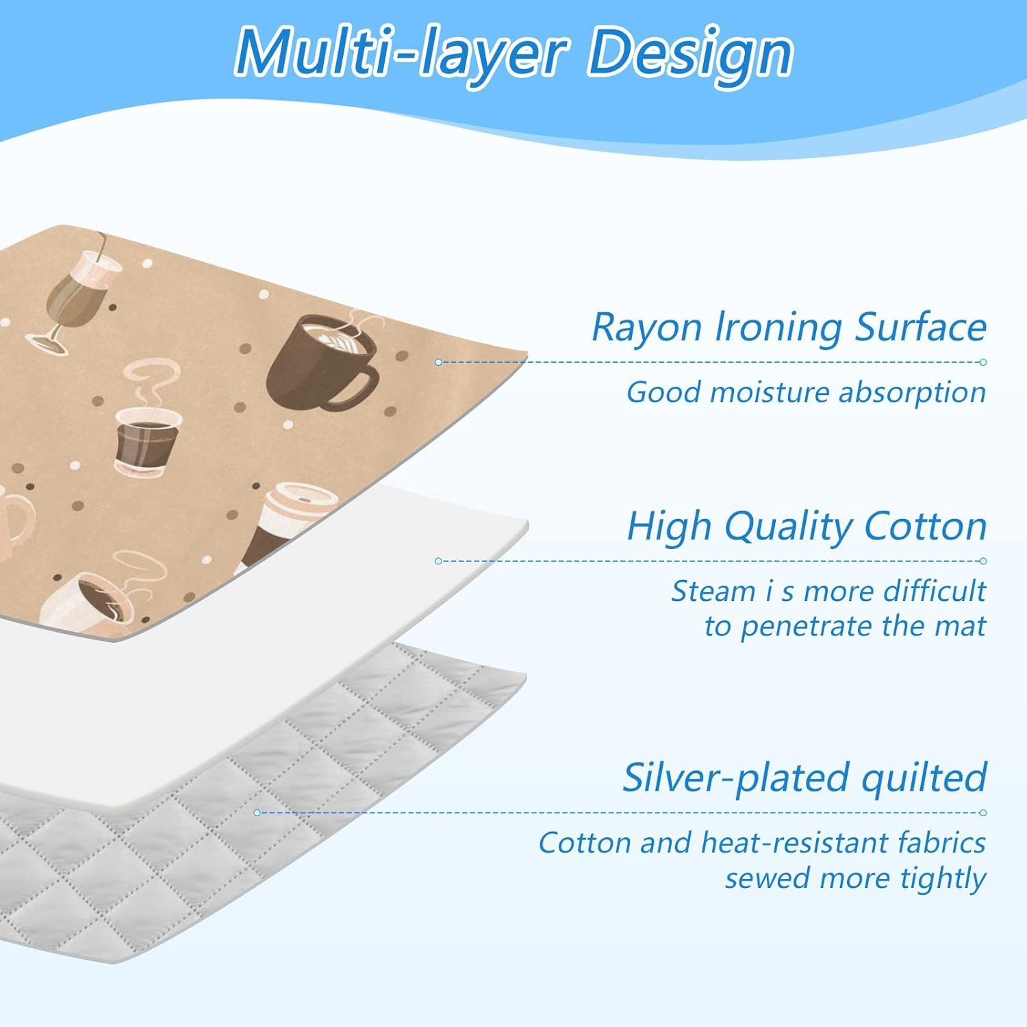 - Material: Our ironing mat for table top has 3 layers, rayon ironing surface + high quality cotton + silver-plated quilted fabric, making it durable to use