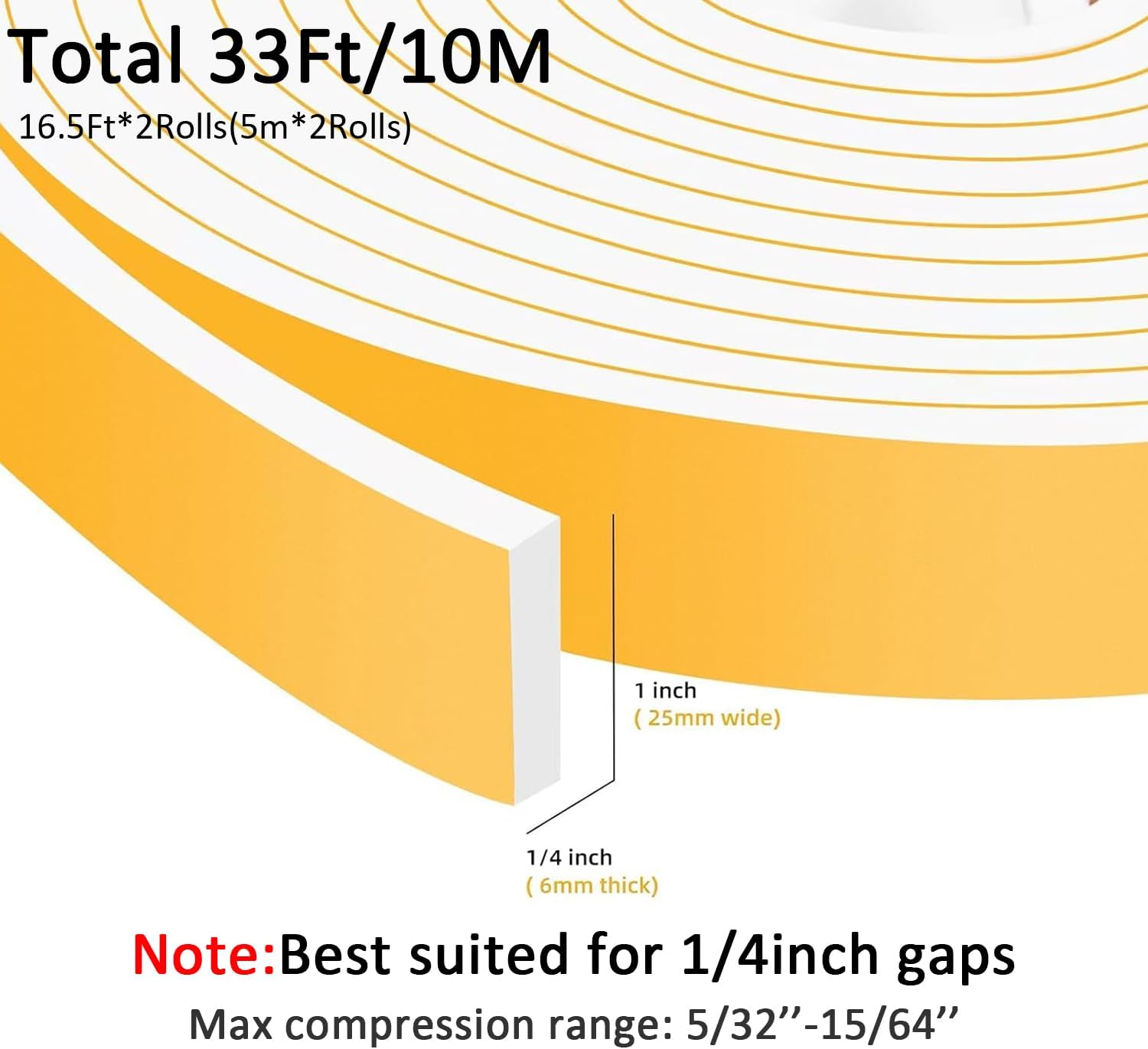High Density Foam Weather Stripping Door Seal Strip Insulation Tape Roll for Insulating Door Frame, Window, Air Conditioner Soundproof Self Adhesive Sealing Weatherstrip(1 in x 1/4 in x 33 Ft)