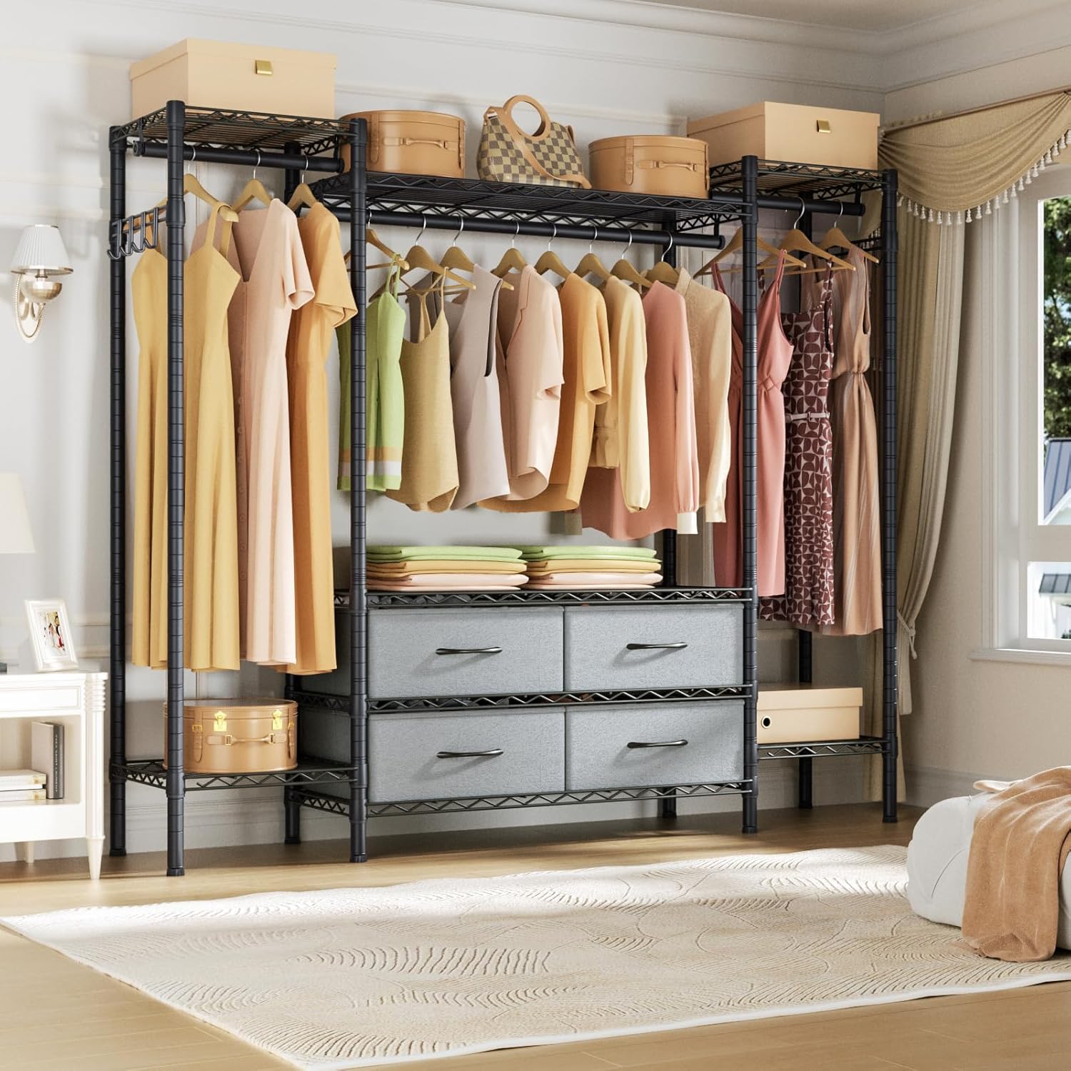 Large Garment Rack Heavy Duty Clothes Rack,Freestanding Closet Portable Clothing Rack with 8 Adjustable Wire Shelves,3 Hang Rods,4 Fabric Drawers,2 Hooks,Metal Closet Storage Wardrobe,MaxLoad 900lbs