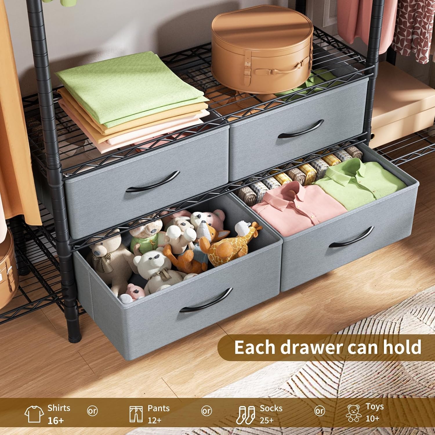 - Versatile 8-Tier Storage Solution: Experience the convenience of our all-in-one closet rack featuring 8 adjustable wire shelves and 2 side hooks. Perfect for storing clothes, accessories, shoes, and more. The 3 detachable hanging bars and 4 fabric drawers with handles cater to various garment sizes, guaranteeing a clutter-free and organized space