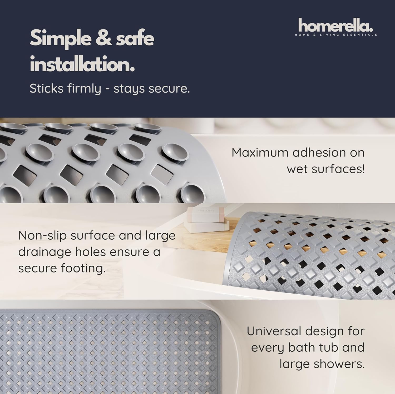 - Incl. 2 Hooks for Drying: Our Special Feature - No more wet anti slip bathtub mat on the edge of the bathtub! Thanks to the 2 self-adhesive hooks the anti slip shower mat can be dried and stored perfectly. They can be removed without leaving any residue.