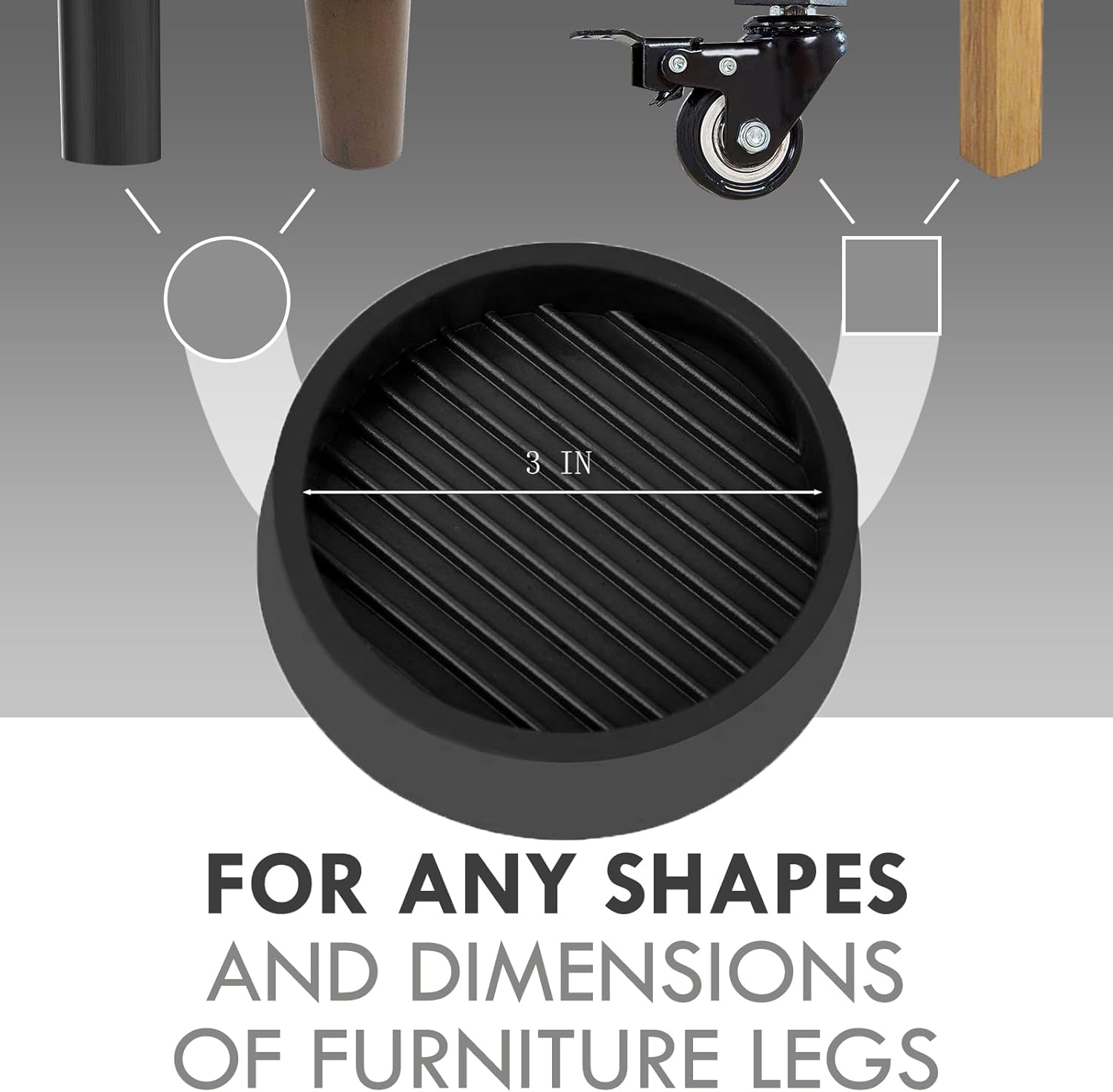 - ENOUGH SIZE - 3X3 Inch black round rubber caster cups, Each round rubber casters cup is large enough to hold the legs of most furniture, and the classic black perfectly with the wood to make the whole look match.