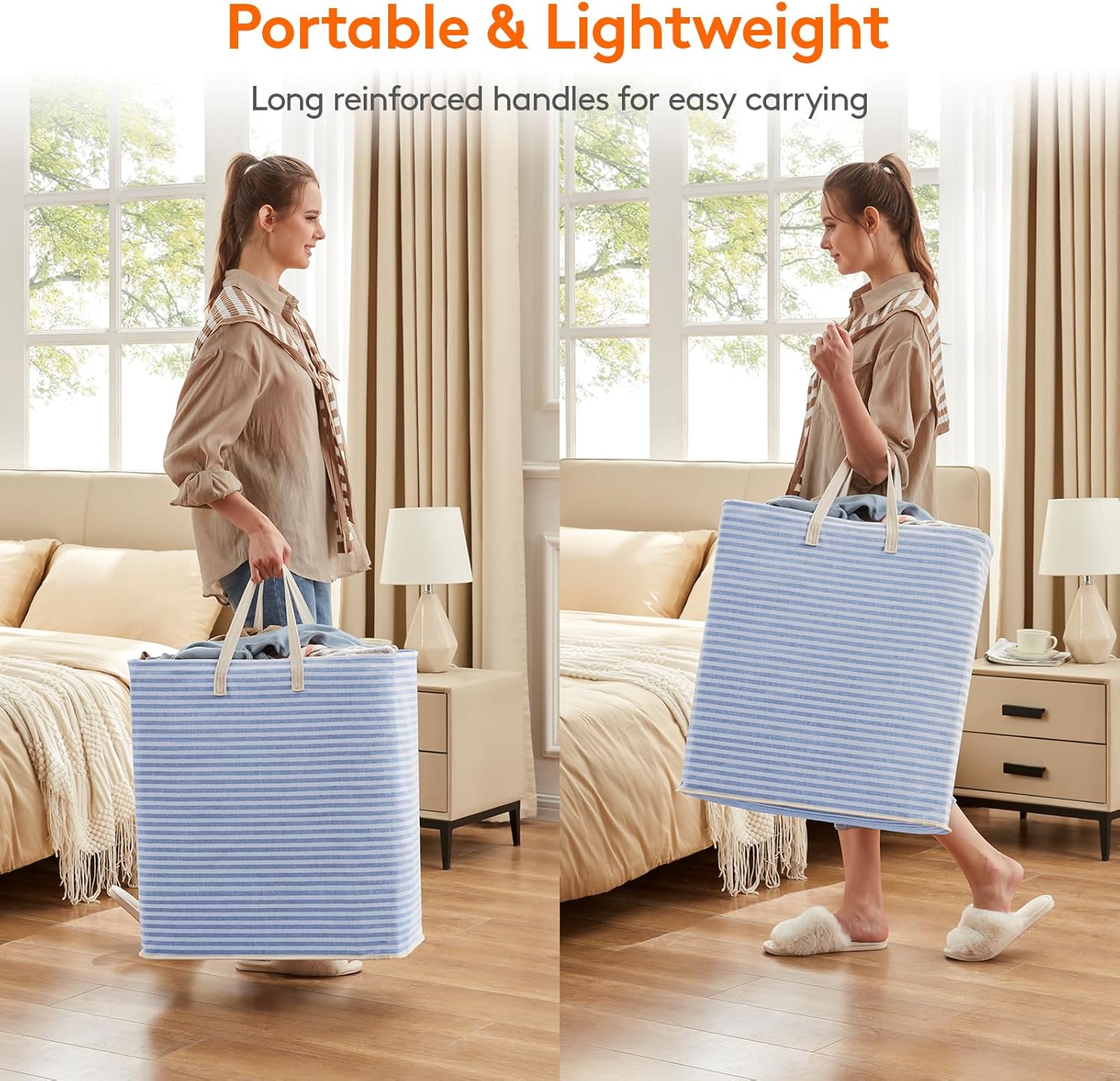 - Easy to Carry: Most clothes hampers for laundry need both hands to carry, but ours can be carried with one hand. The handles are reinforced with strong stitching and are long enough for single-handed carry. Our large laundry baskets can be easily carried up and down stairs or to a laundromat with ease.