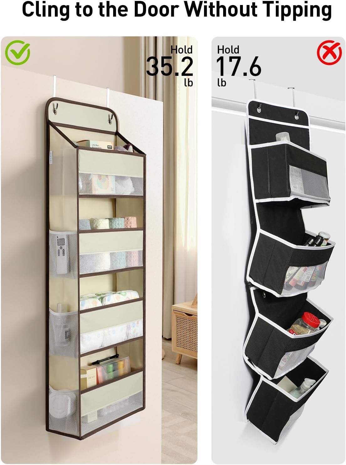 - Swing-proof & 35.2 LB Load Capacity: Yecaye over the door storage organizer stands out for its innovative design and durability. The closet organizers and storage feature strong stitching to connect the pockets, built-in strengthened side cardboards, strong reinforced bottom cardboards, and fiberglass tubes to prevent sagging and leaning. These features ensure that the door hanging organizer can keep in shape and easily hold up to 35.2 lbs