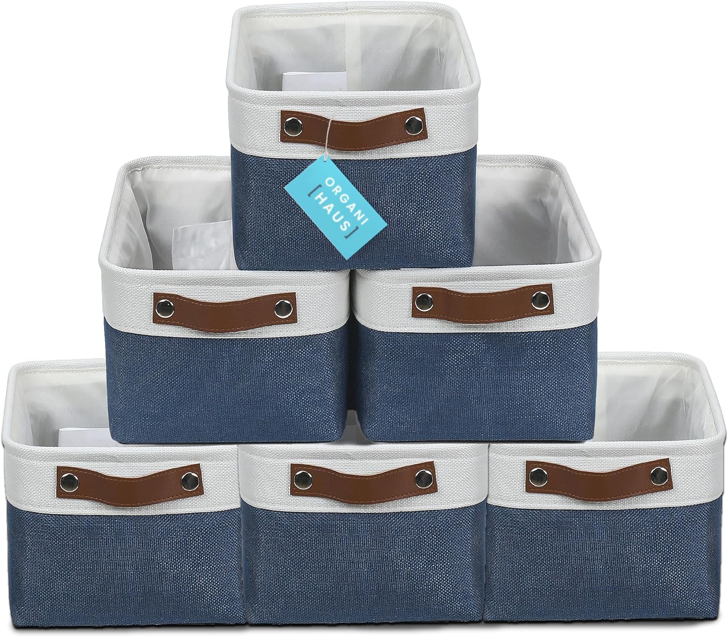 OrganiHaus Small Fabric Storage Baskets for Shelves 6 Pack, 12x8in Closet Storage Bins for Shelves, Cloth Baskets for Organizing, Linen Closet Organizers, Fabric Basket, Navy Blue/White