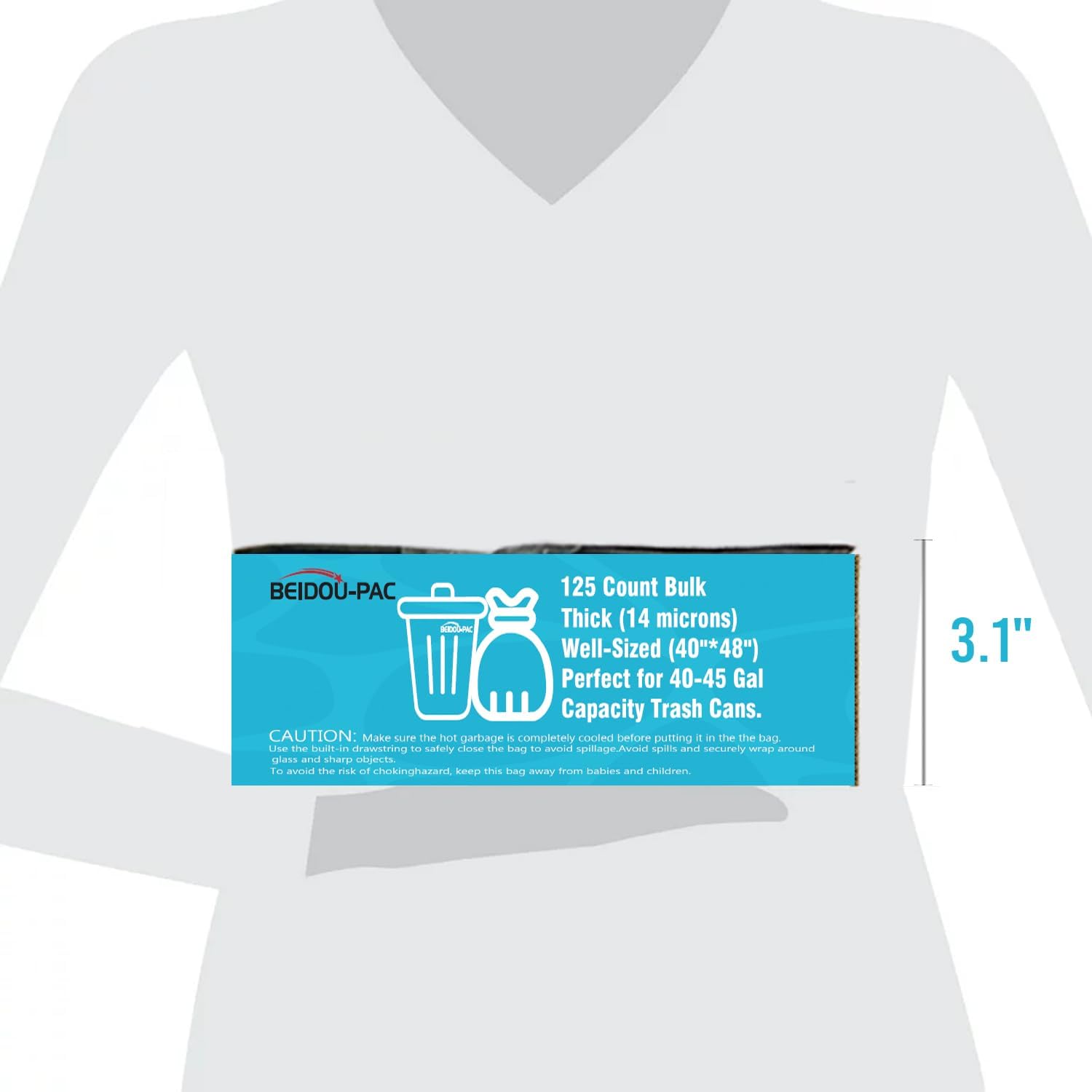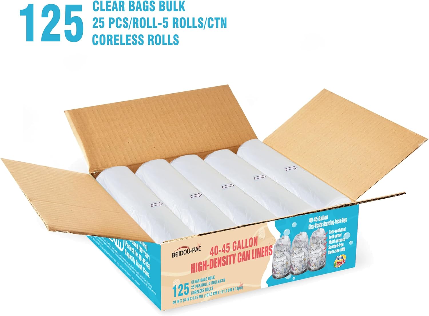 - 1, Product information: BEIDOU-PAC 40-45 gallon large clear plastic recycling trash bags, Size: 40" x 48"x 14 mic, Total 125 clear bags bulk (25 PCS/ROLL, 5 CORELESS ROLLS/CTN), Perfect for 40-45 Gal Capacity Office, commercial, industrial, or residential waste.