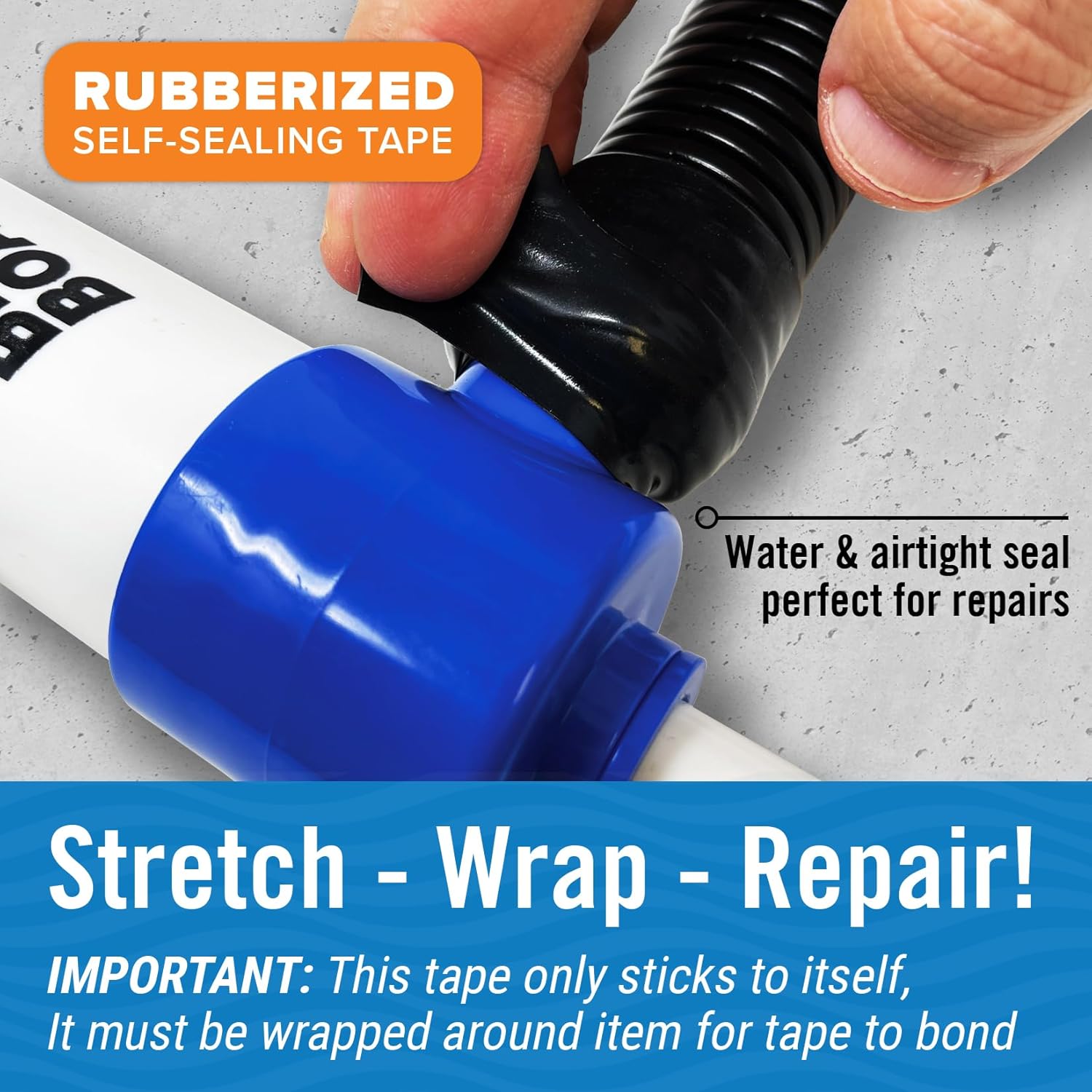 - ULTRA STRONG HOLD: Stretch the tape while wrapping the item. After two minutes, the plumbing tape for sealing forms a permanent bond. Our black self bonding leak stop tape also works great as waterproof automotive tape and irrigation repair tape.