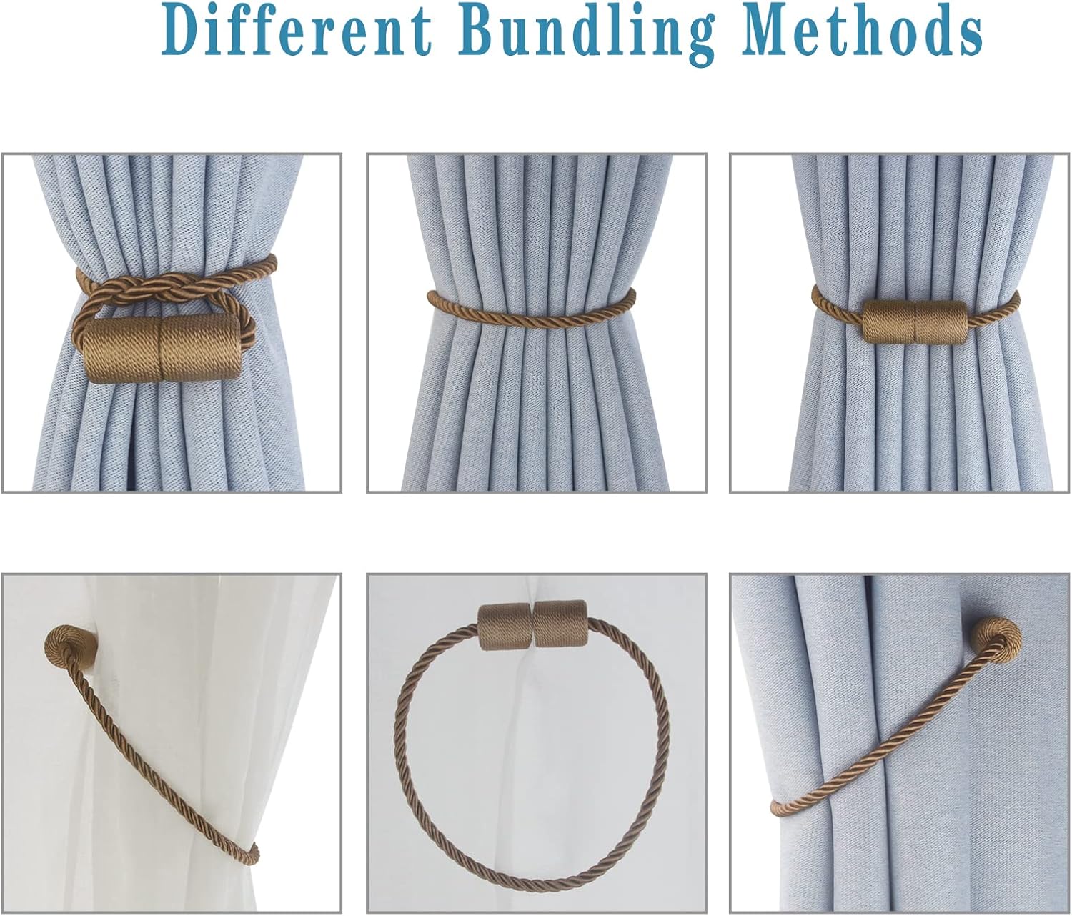 - High-Quality Materials- Magnetic curtain tie backs use an upgraded version of nickel-plated magnets, which are strong and smooth. The brightly colored twisted woven ​texture rope is hand-woven with premium polyester materials. very soft and good feeling. Beige/Gold/Black/White/Grey/Khaki/Coffee/Blue -Eight colors to choose from