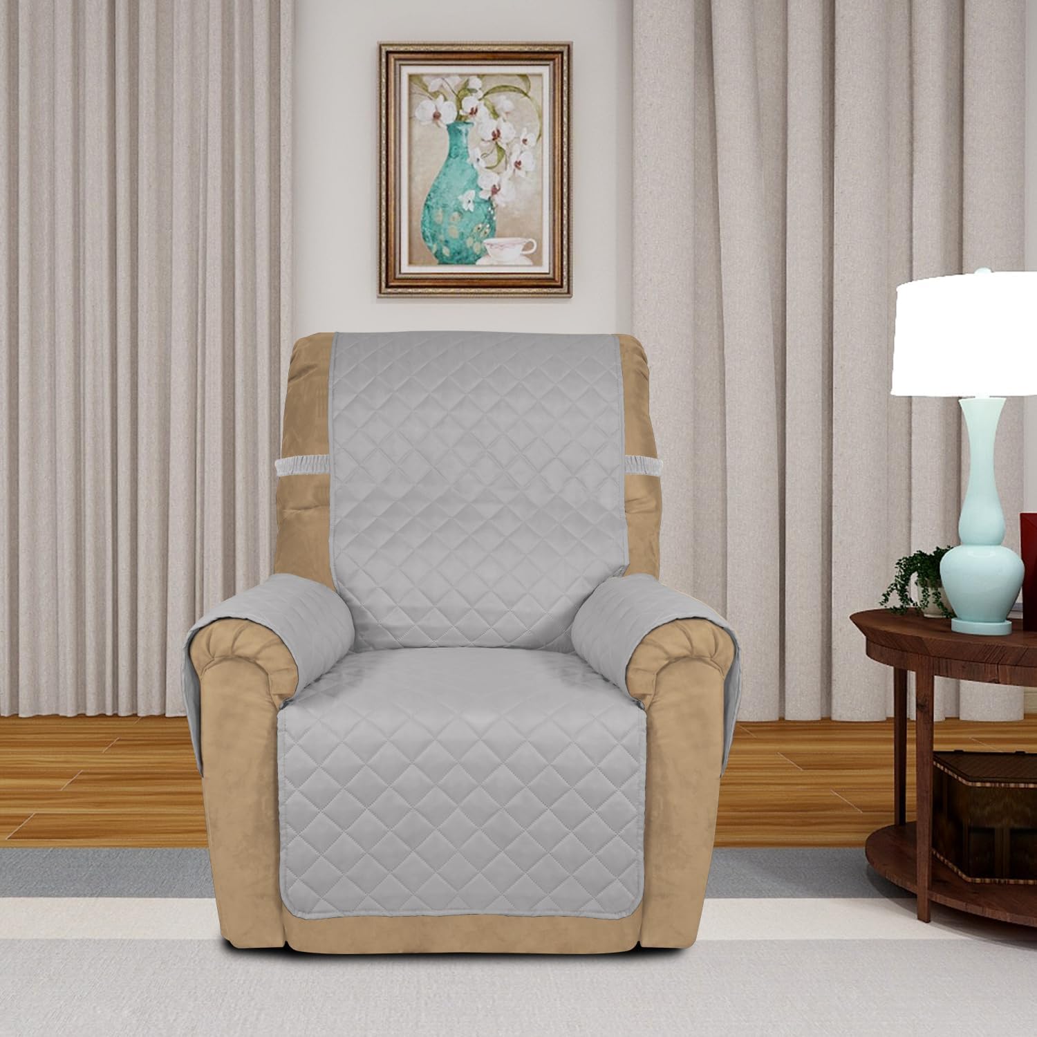 PureFit Reversible Quilted Sofa Cover, Water Resistant Slipcover Furniture Protector, Washable Couch Cover with Non Slip and Elastic Straps for Kids, Dogs (Small Recliner, Light Gray/Light Gray)
