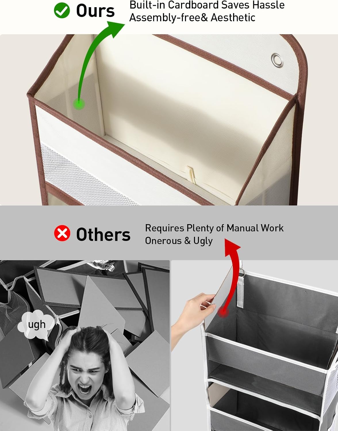 - Easy Assembly, No Hassle: Unlike other brands' door hanging organizer bedroom that comes with piles of cardboard that need complicated manual assembly, Our over the door storage comes pre-inserted with cardboard in the pockets, giving you a tool-free assembly within seconds. Simply hang the hooks over the door, then hang the over door storage, insert 5 cardboard bottoms, and you're ready to go