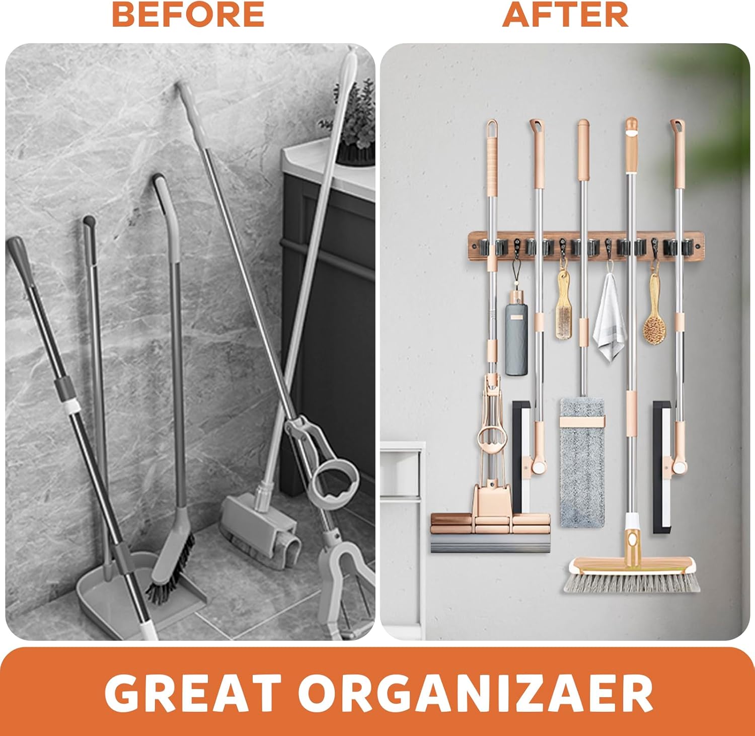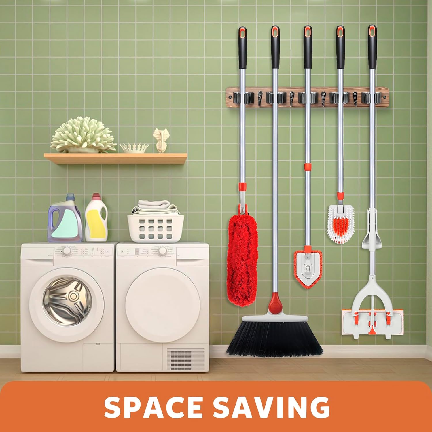 - ORGANIZATION and STORAGE: Whether you're hanging brooms, mops, aprons, cleaning cloths or various other items, it provides a simple and effective way to keep your space tidy. You can easily organizer your home, such as laundry room, kitchen, closet, pantry, basement and other small space