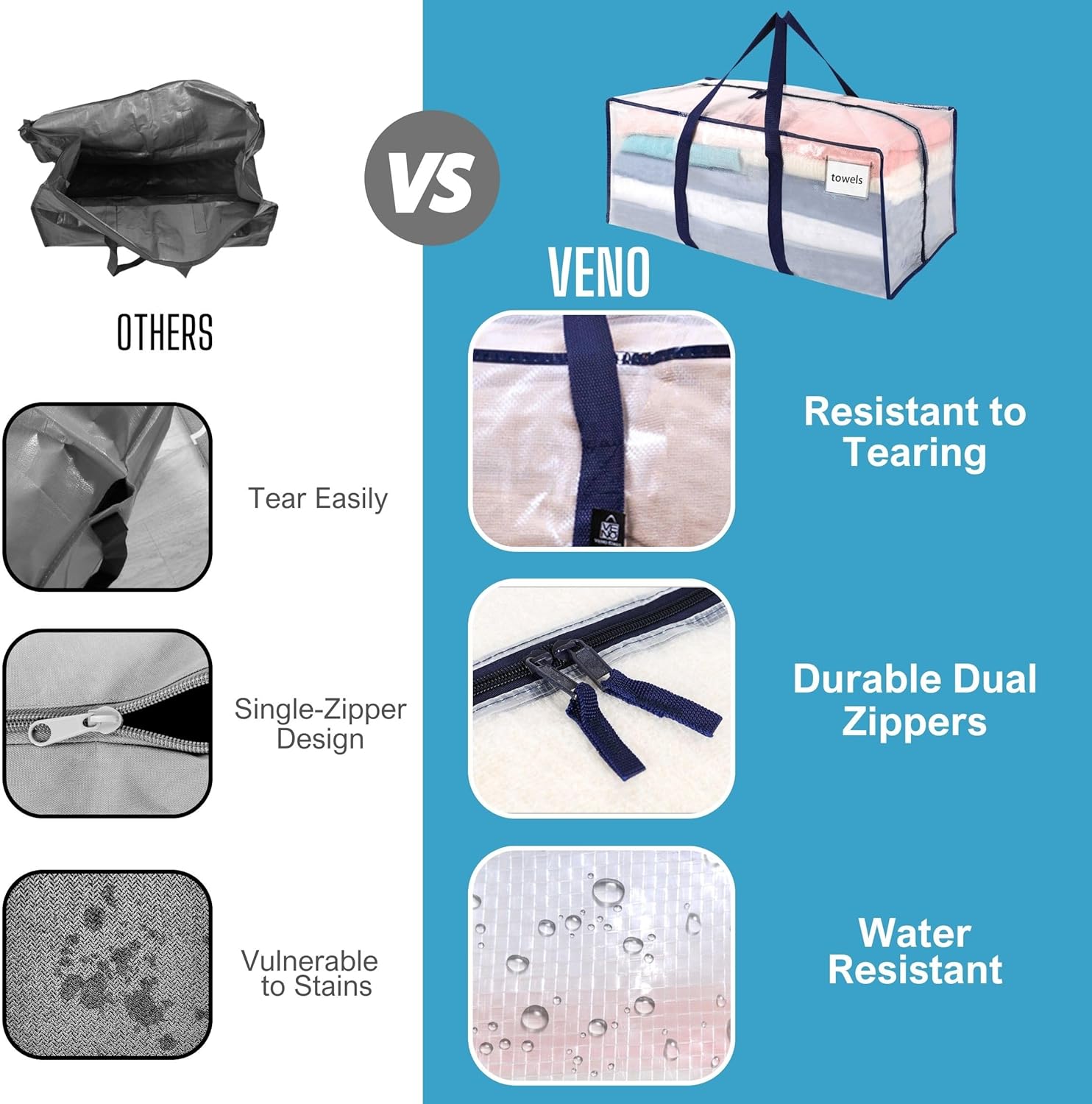 VENO 6 Pack Moving Bags Plastic Storage Totes Clothes Organization Large W Lid/Zipper. Packing Boxes/Bins Alternative. Space Saving Foldable College Supplies Essentials (Clear, 6 Pack)