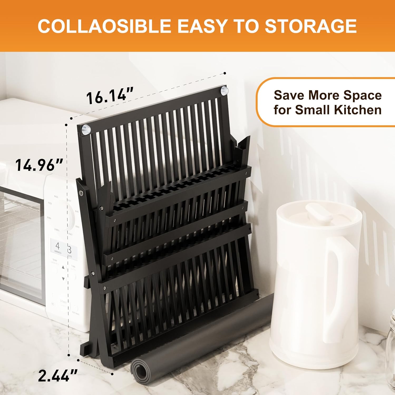 - Large Capacity: This beautifully bamboo dish drying rack for kitchen counter accommodates your complete dishes set - including dinner plates, cups, forks, and spoons. Keep your counter tidy and not cluttered. A foldable dish drying rack allows you to efficiently dry your dishes, mugs, pots and pans. dish racks for kitchen counter designed for maximum capacity and ultra-convenience. 3 tiers and 18 slots are perfect for 18 full-size square or round plates, cups, and even a cutting board