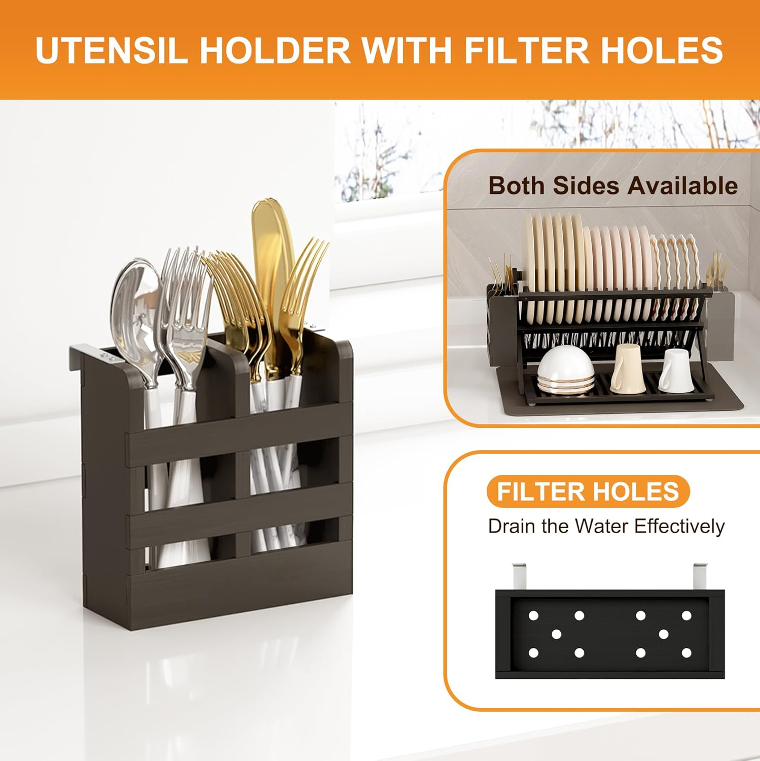 - Utensil Holder: Size: 5.91’’×2.36’’×5.98’’. The utensil rack is a handy organizer that holds flatware and cooking utensils which can be hung oneither side of the bamboo dish drying rack for kitchen counter with metal hooks. Reliable and strong, will not fall. You can put knives and forks. Our utensil holder can hold 20+ knives, forks and spoons, or cleaning brushes. Filter holes on the bottom drain the water effectively