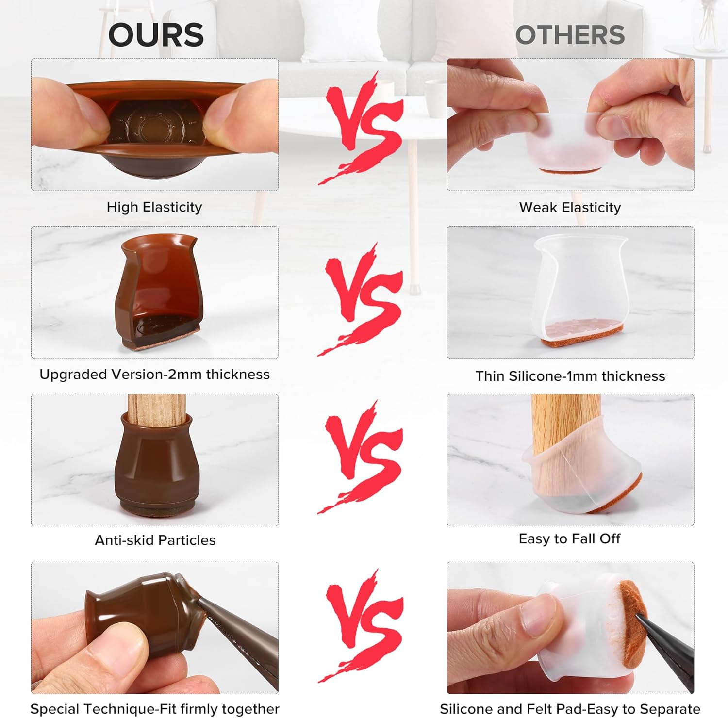 - ✅【Comprehensive Improvement】The rubber protectors are made of a combination of silicone covers and felt pads.Gels and nails are not used. After investigation, it is found that the chair leg cushions made of silicone and gel are easy to separate the felt after use, and the silicone will break. So after improvement, we injected the silicone and felt into one body, and the inner wall was thickened to 2mm, which greatly enhanced the pull resistance and abrasion resistance of the chair leg cushions.