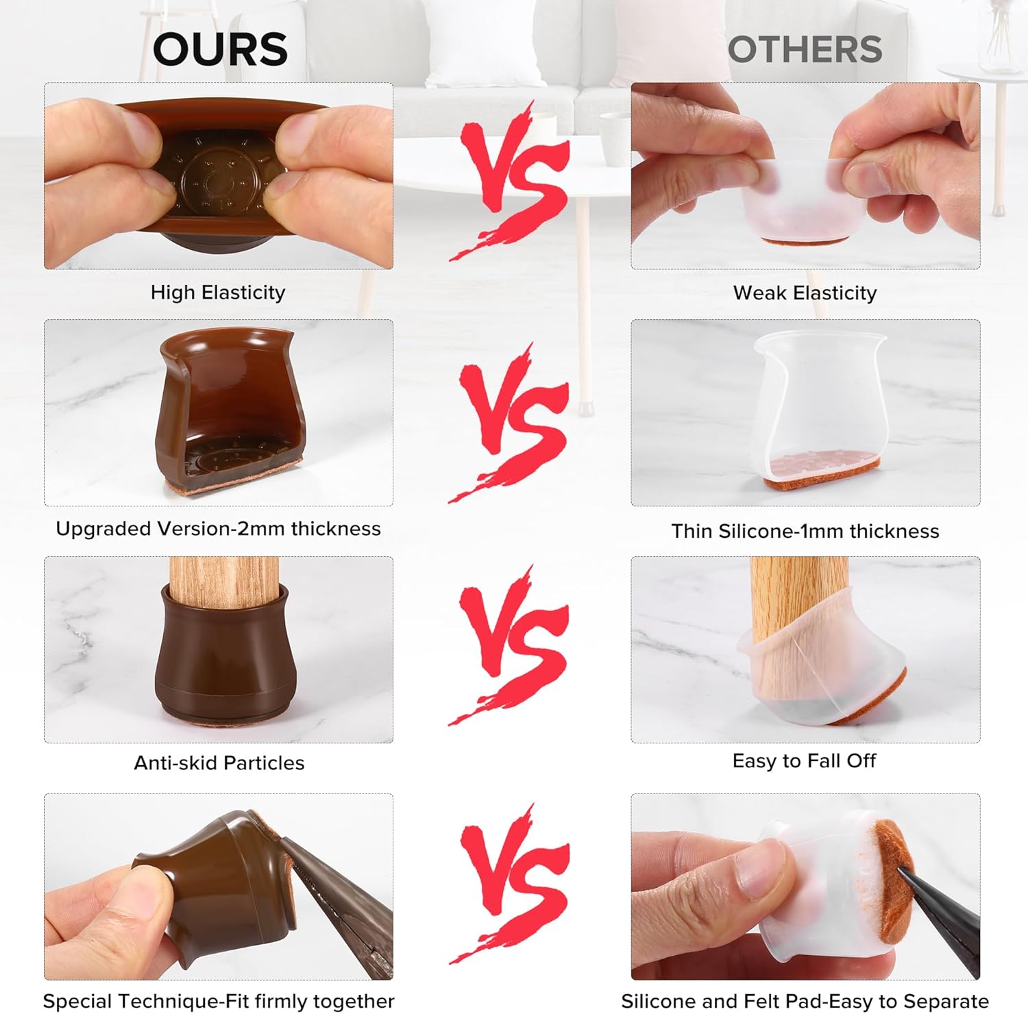 - ✅【Latest Upgrade】Compared with most of the traditional 1mm furniture pads on the market, our silicone chair leg protectors are made of 2mm thick silicone, which will never be damaged, durable. The ruby for chair legs will not change color when stretched. Inside of the inner sleeves are particles with anti-slip, which will firmly fix the chair and never make the covers fall off. Felt pads at the bottom make your furniture move silently and smoothly along floors without leaving marks and noise.
