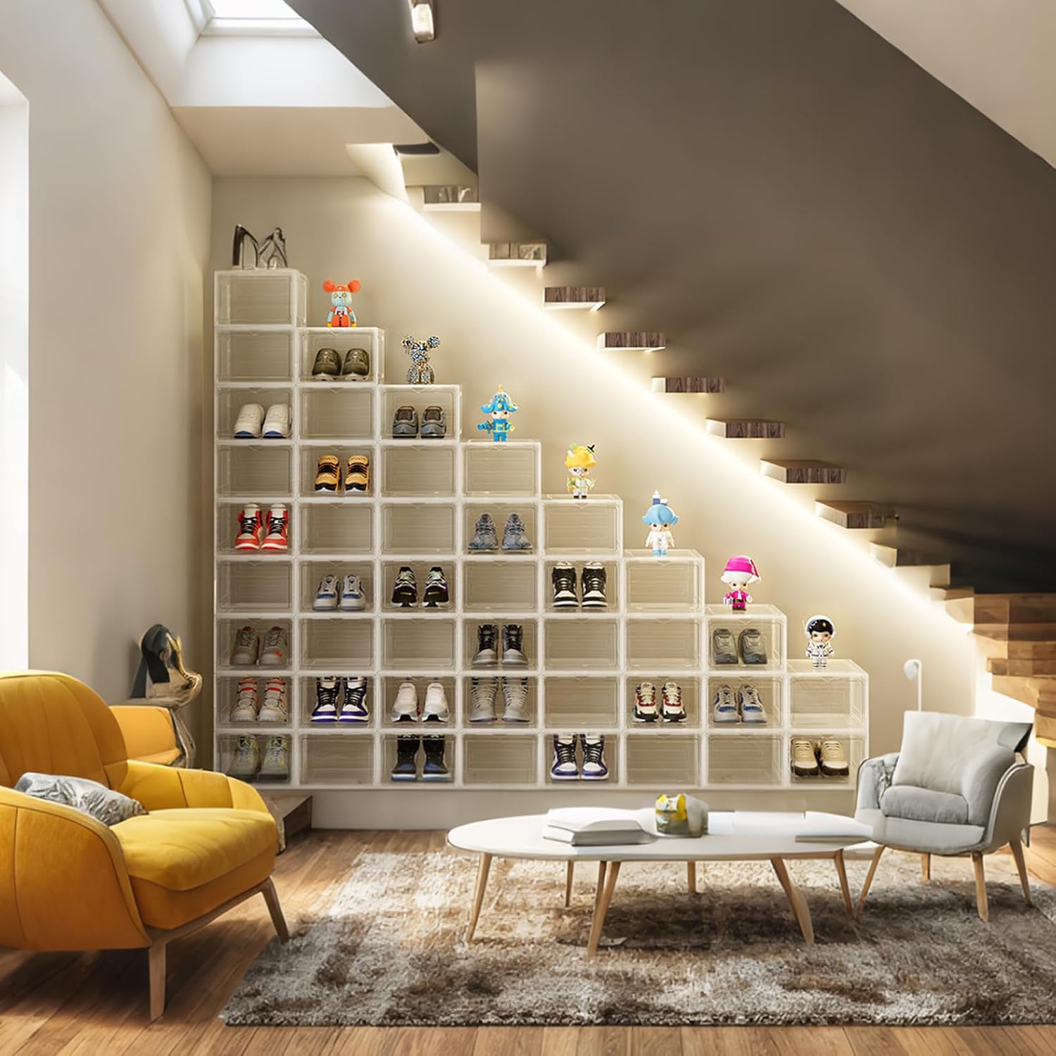 - 【Sturdy Stackable Shoe Box】Our Sneaker Storage are made of hard plastic, sturdy and durable unlike other soft plastic shoe boxes, plus the shoe container all have linking points between them to prevent them from falling when tilted,these stackable shoe boxes are easy to organize and store to keep your porch or closet clean and tidy.